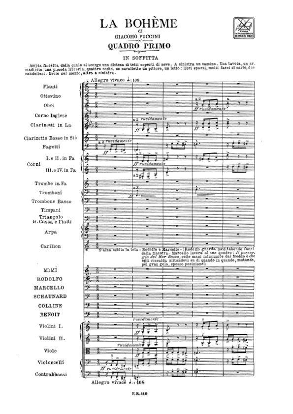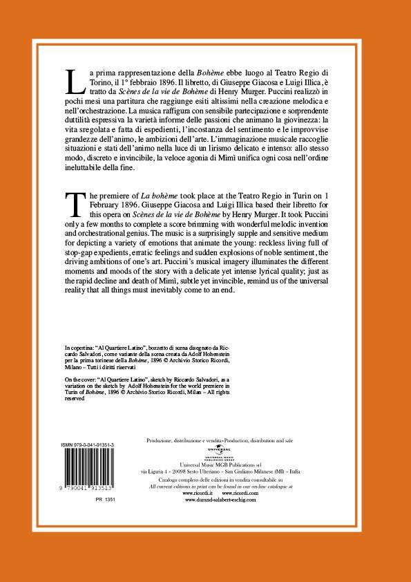 The premiere of La Bohème took place at the Teatro Regio in Turin on 1 February 1896. Giuseppe Giacosa and Luigi Illica based their libretto for this opera on Scènes de la vie de Bohème by Henry Murger. It took Puccini only a fewmonths to complete a score brimming with wonderful melodic invention and orchestrational genius. The music is a surprisingly supple and sensitive medium for depicting a variety of emotions that animate the young: reckless living full of stop-gapexpedients, erratic feelings and sudden explosions of noble sentiment, the driving ambitions of one’s art. Puccini’s musical imagery illuminates the different moments and moods of the story with a delicate yet intense lyrical quality; just as therapid decline and death of Mimì, subtle yet invincible, remind us of the universal reality that all things must inevitably come to an end. On the cover: “Al Quartiere Latino”, sketch by Riccardo Salvadori, as a variation on the sketch by Adolf Hohenstein for the world premiere in Turin of Bohème, 1896 © Archivio Storico Ricordi