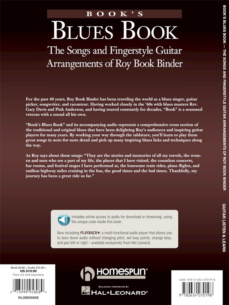Vétéran chevronné avec un son unique, Roy Book Binder chante, joue de la guitare et écrit des chansons depuis les années 60. Ce coffret livre/CD présente des morceaux de blues traditionnels et originaux qui ont enchanté son public pendant des années. Comprend d’excellentes leçons et une introduction de Roy, des transcriptions note pour note avec tablature, et un CD d’exemples enregistrés pour faciliter l’apprentissage. Niveau 3.