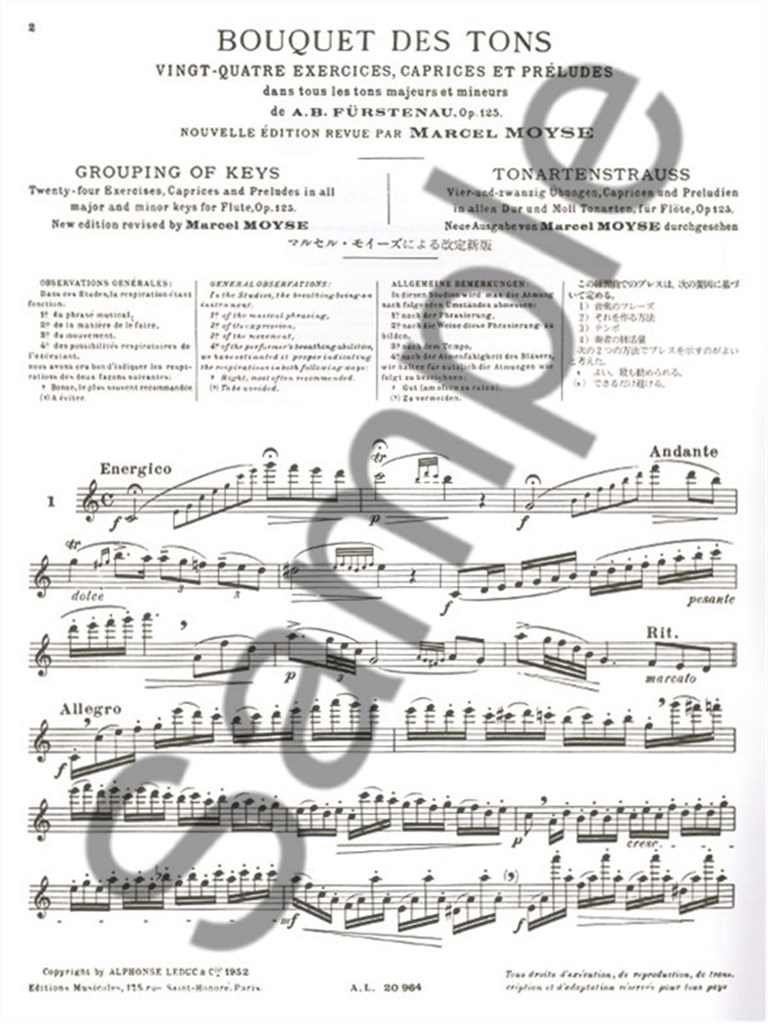 Written by the French flautist and composer Marcel Moyse, Grouping of keys, Op. 125 by Fürstenau is a set of studies and exercises on keys for advanced players, as it is considered as quite difficult. Arranged by Marcel Moyse, Grouping of keys, Op. 125 by Fürstenau was a work originally by the German flautist Anton Berhnard Fürstenau. It would definitely complete the series of work by Marcel Moyse also published by Alphonse Leduc, such as 'Gammes et Arpèges' (1933), 'De la Sonorité' (1934) and 'Mécanisme-Chromatisme' (1927) among others. Considered as a maestro by some musicians, Marcel Moyse (1889-1984) has written various Flute studies and exercises books, that comprisesan excellent method for all levels.