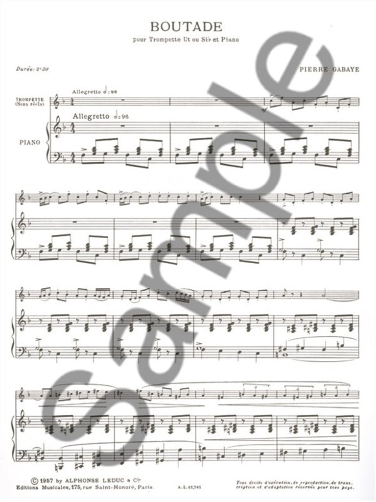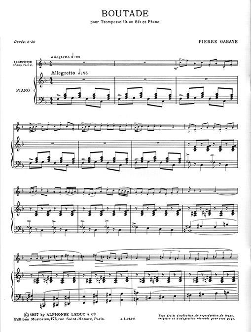 Successful French composer, Pierre Gabaye (1930-2000) studied at the Paris Conservatoire where he won the 1956 Prix de Rome. His competence is proven by his Boutade for Trumpet and Piano. Gabaye 's compositional style has been described as following the French neo-classical tradition, such as the music of Poulenc. Boutade exemplifies the composer's light-hearted music. A typical performance of the work lasts about two and a half minutes. For all advanced trumpeters seeking chirpy, lively and upbeat repertoire, Gabaye 's Boutade is ideal.