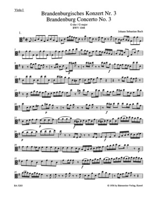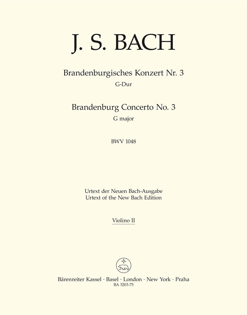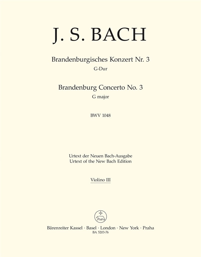Authoritative Urtext edition of Johann Sebastien Bach 's Brandenburg Concerto No. 3 In G BWV 1048. The six Brandenburg Concertos BWV 1046-1051, prized jewels of the world's musical heritage, were written in 1721 during Bach ’s appointment in Cöthen. Of the six works, Bach originally wrote earlier versions of numbers 1 and 5 which differ not only with regard to articulation but also at times different tones, different rhythms, instrumentation and of course form. These Urtext publications [BA 5201-BA 5206] taken from the New Bach Edition now give performers the possibility to play these earlier versionsperhaps even along side the version known today.