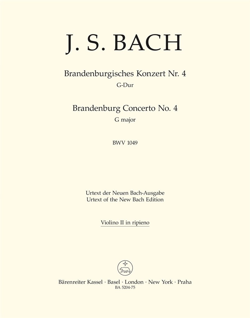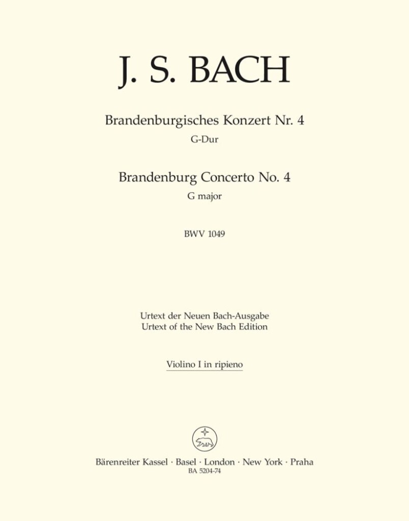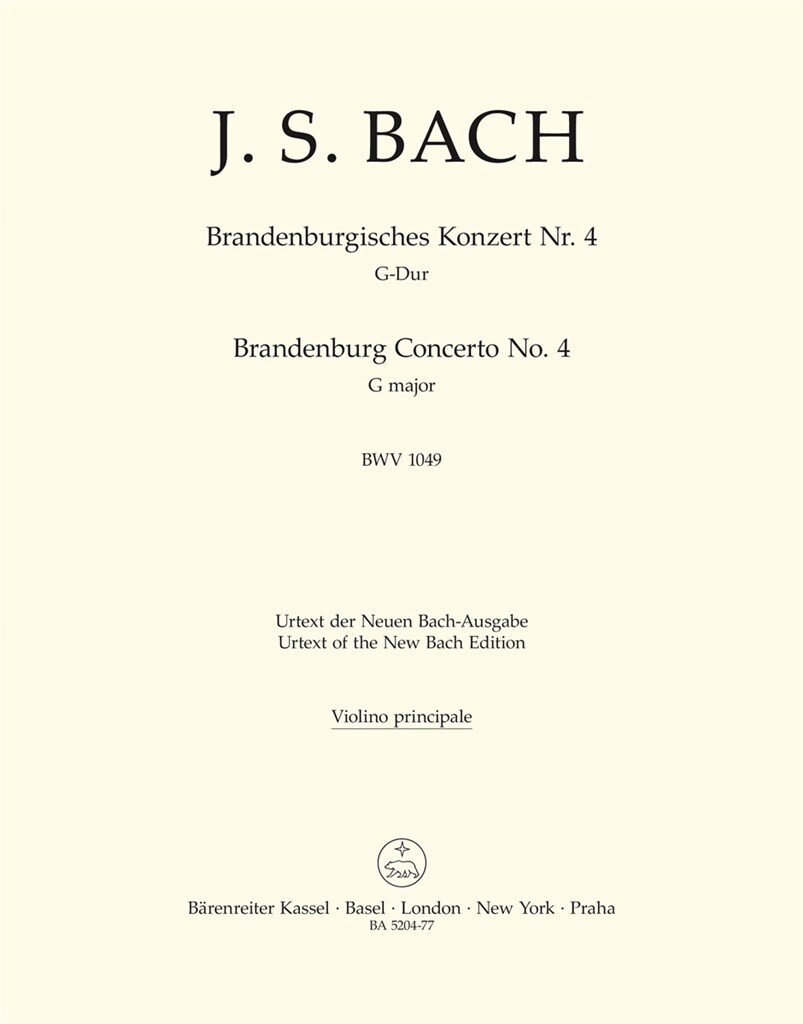 Authoritative Urtext edition of Johann Sebastien Bach 's Brandenburg Concerto No. 4 In G BWV 1049. The six Brandenburg Concertos BWV 1046-1051, prized jewels of the world's musical heritage, were written in 1721 during Bach ’s appointment in Cöthen. Of the six works, Bach originally wrote earlier versions of numbers 1 and 5 which differ not only with regard to articulation but also at times different tones, different rhythms, instrumentation and of course form. These Urtext publications [BA 5201-BA 5206] taken from the New Bach Edition now give performers the possibility to play these earlier versionsperhaps even along side the version known today.
