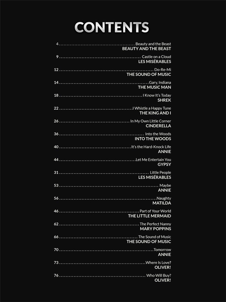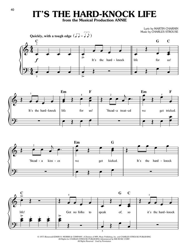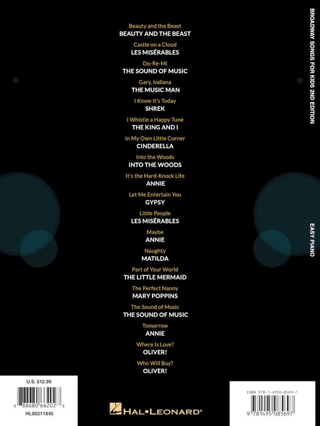 Includes 19 beloved songs from the Great White Way in easy piano arrangements, accessible for kids. Songs: Beauty and the Beast - Castle on a Cloud - Do-Re-Mi - Gary, Indiana - Into the Woods - It's the Hard-Knock Life - Let Me Entertain You - Part of Your World - The Sound of Music - Tomorrow - Where Is Love? - and more.