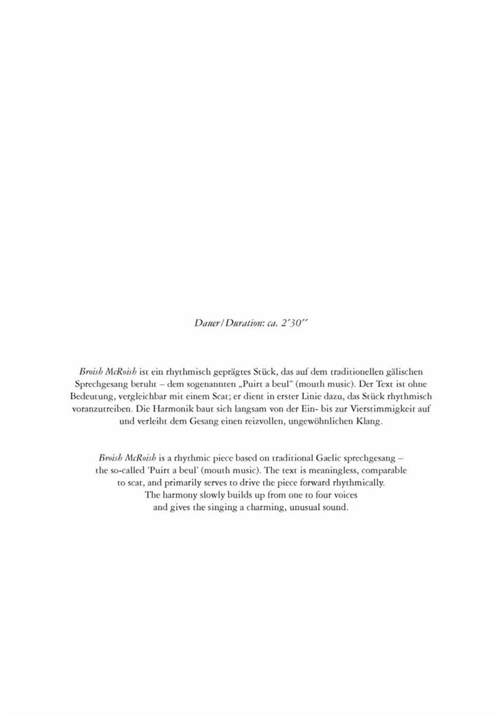 Broish McRoish is a rhythmic piece based on traditional Gaelic sprechgesang - the so-called ‘Puirt a beul’ (mouth music). The text is meaningless, comparable to scat, and primarily serves to drive the piece forward rhythmically.The harmony slowly builds up from one to four voices and gives the singing a charming, unusual sound.