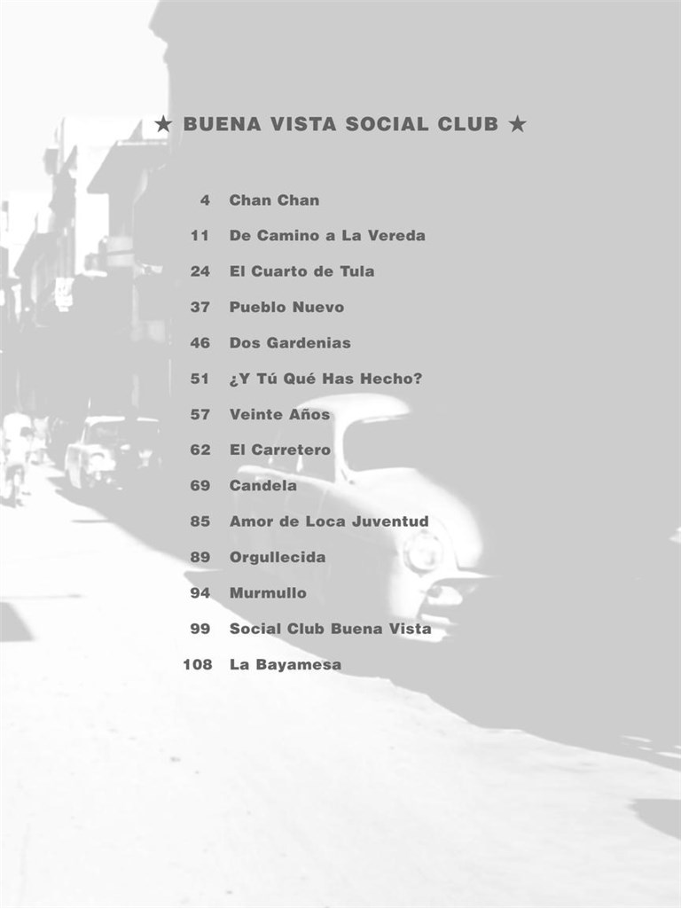 Ce livre propose 14 fabuleuses chansons latines issues de la bande originale primée aux Grammy Awards du documentaire de Wim Wenders, nommé aux Oscars, sur le voyage de Ry Cooder à La Havane pour capturer les légendaires musiciens locaux de Cuba en action. Comprend les chansons : Amor De Loca Juventud · Club social de Buena Vista · Candela · Chan Chan · De Camino A La Vereda · Dos Gardenias · El Carretero · El Cuarto De Tula · La Bayamesa · Murmullo · Orgullecida · Pueblo Nuevo · Veinte Años · Y tú qué has hecho ?.