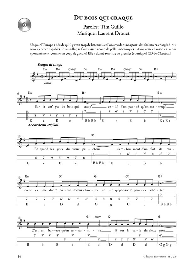 15 chansons, paroles, accords de guitare, partitions et tablatures pour accordéon diatonique