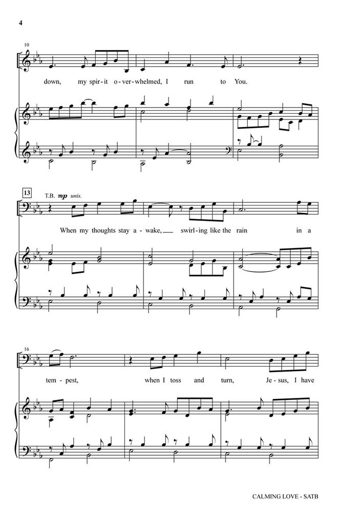 Utilisations : Général, Carême, Communion Écriture : Ésaïe 43:2 - II Timothée 1:7 Une mélodie d’une beauté saisissante porte un message de réconfort et de paix dans cet hymne d’adoration. L’écriture au piano est très spéciale, et l’écriture vocale coule naturellement en phrases délicates qui enveloppent parfaitement ce texte rassurant.