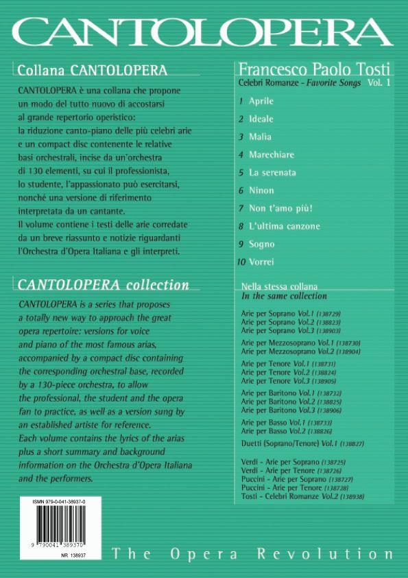 Cette série unique et passionnante vous donne l’occasion d’apprendre certaines des plus grandes chansons de Francesco Tosti avec des pistes orchestrales complètes. 10 pièces d’opéra ont été sélectionnées, dont Aprile, La Serenata et L’Ultima Canzone, présentées en notation complète avec accompagnement de concert pour piano. De plus, un CD professionnel est inclus qui présente l’arrangement orchestral à grande échelle de chaque air, vous permettant de ressentir la puissance et la magie d’une performance à grande échelle. Il existe même une version de chacune avec un chanteur établi afin que vous puissiez entendre la pièce en entier. Un excellent outil de répétition, ou la façon idéale d’initier votre voix aux merveilles et aux rigueurs de l’Opéra.