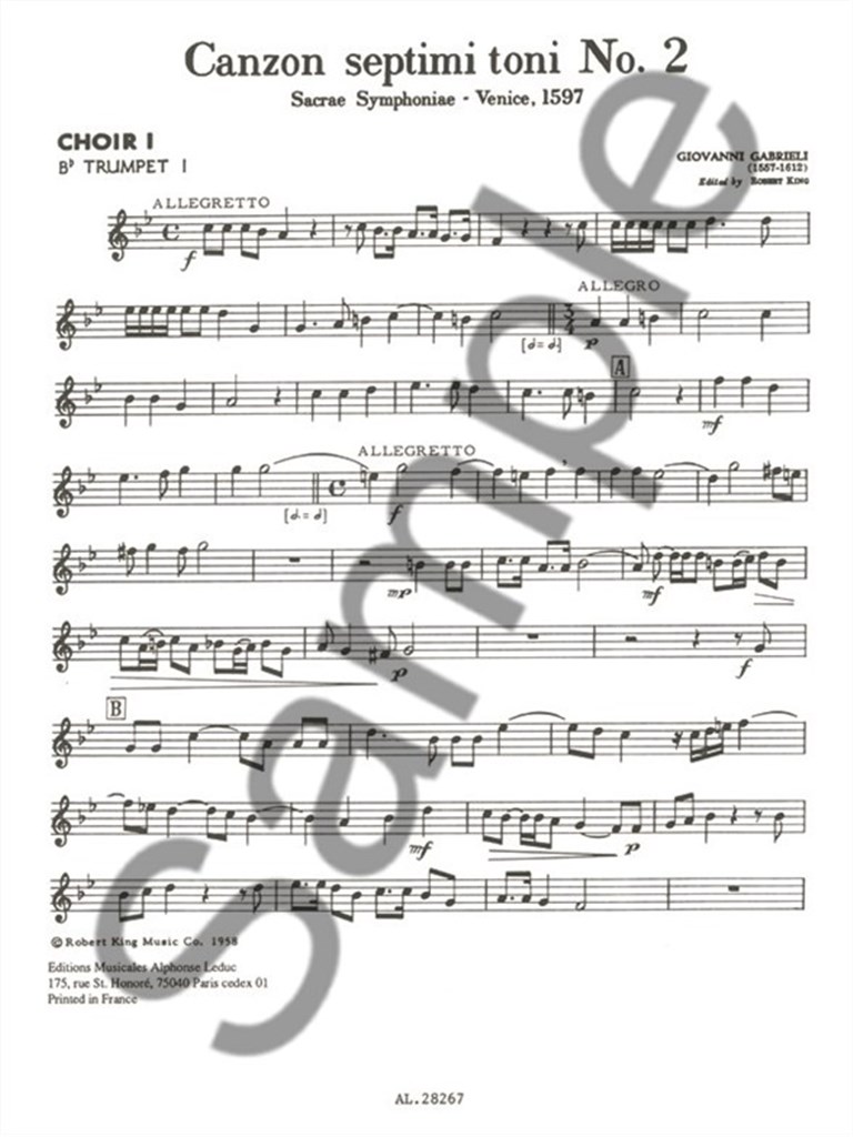 Transcribed by popular brass arranger Robert King, this edition of Giovanni Gabrieli 's Canzon septimi toni No. 2 provides an exciting performance piece for a large Brass Ensemble. Being one of the most influential musicians during the shift from the Renaissance to the Baroque era, it is no secret that the composer committed himself primarily to vocal and sacred works. However, his Canzon septimi toni No. 2 represents an important turn, not only in the composer's career, but in musical history. Composed in 1597, this piece paved the way for what would soon become the new Baroque concerto style, which remains popular to this day. King 's arrangement of this historical work isindispensable for Brass Ensembles.