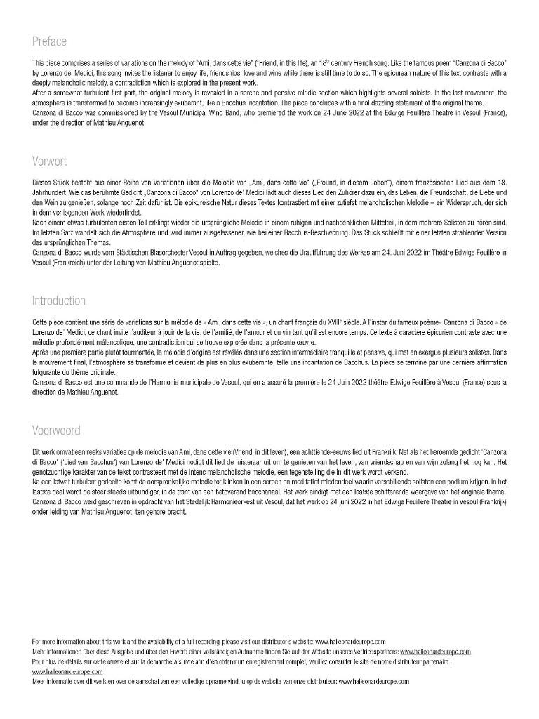 Cette pièce contient une série de variations sur la mélodie de « Ami, dans cette vie », un chant français du XVIIIe siècle. A l’instar du fameux poème« Canzona di Bacco » de Lorenzo de’ Medici, ce chant invite l’auditeur à jouir de la vie, de l’amitié, de l’amour et du vin tant qu’il est encore temps. Ce texte à caractère épicurien contraste avec une mélodie profondément mélancolique, une contradiction qui se trouve explorée dans la présente œuvre. Après une première partie plutôt tourmentée, la mélodie d’origine est révélée dans une section intermédiaire tranquille et pensive, qui met en exergue plusieurs solistes. Dans le mouvement final, l’atmosphère se transforme et devient de plus en plus exubérante, telle une incantation de Bacchus. La pièce se termine par une dernière affirmation fulgurante du thème originale. Canzona di Bacco est une commande de l’Harmonie municipale de Vesoul, qui en a assuré la première le 24 Juin 2022 théâtre Edwige Feuillère à Vesoul (France) sous la direction de Mathieu Anguenot.