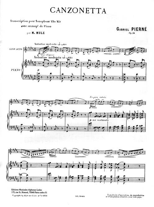 Canzonetta, Op. 19 is a piece for Alto Saxophone and Piano accompaniment composed by Gabriel Pierne and arranged by Marcel Mule. Initially written for Clarinet and Piano, the piece was written in 1888 and can be played by advanced players with a fairly high difficulty level. Composed in a single movement, the piece features some different sections linked together. It starts with dotted rhythms that are slightly reminiscent of a siciliano, and is followed by a part that sounds like a Scherzando. The dotted rhythms disappear in the Piu Vivo section but the opening theme soon comes back before a grandiose finale. Gabriel Pierne (1863-1937) was a French composer, conductor and Organ player. He won the French Prix de Rome 1882.