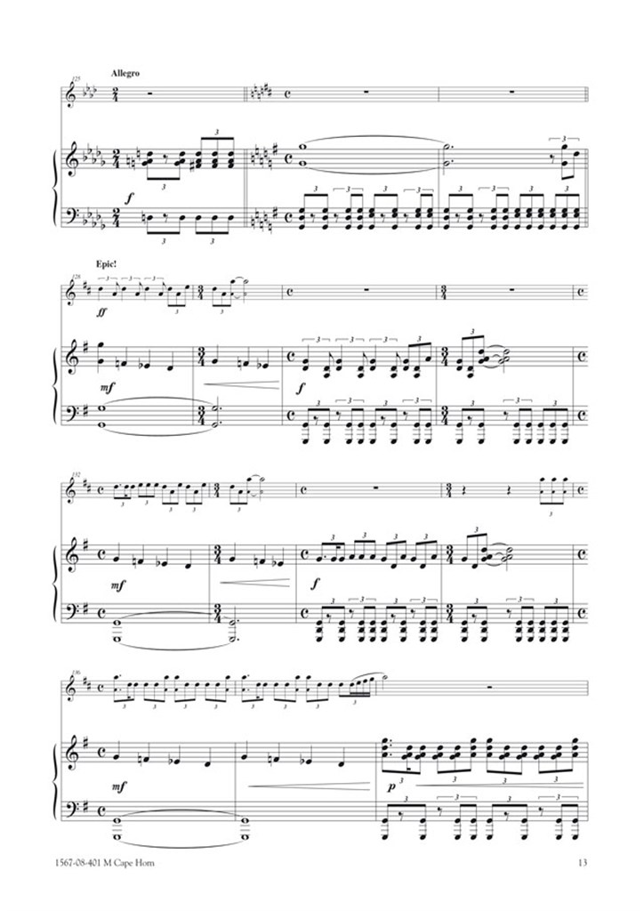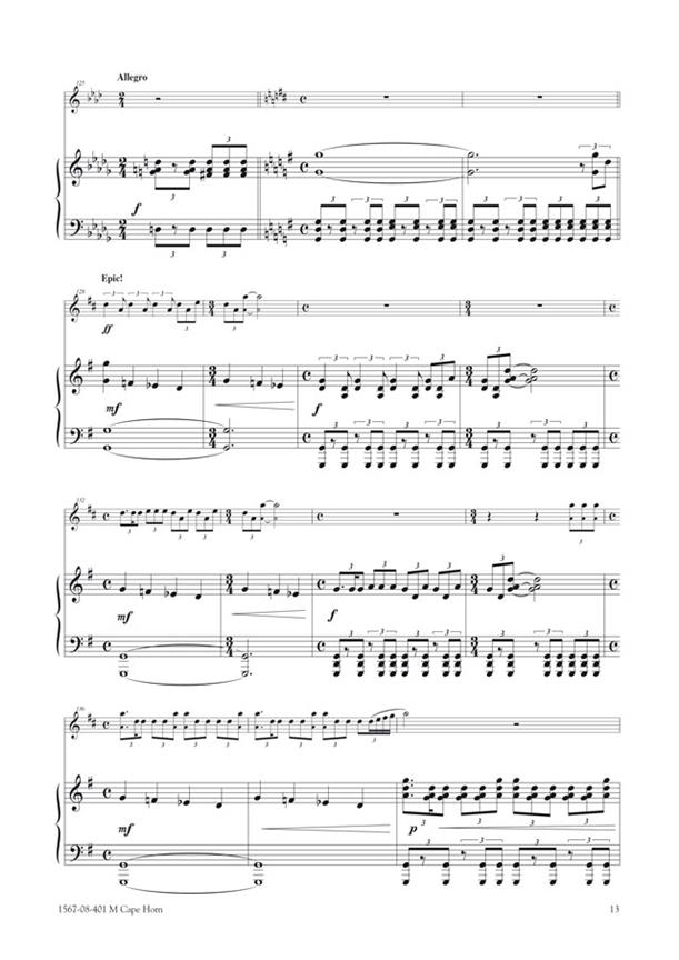 Cape Horn (Le cap Horn) est une oeuvre pour Cor solo et Piano. La musique reflète la beauté et les dangers de cette région. Animé par un esprit de curiosité et soucieux d'élargir le répertoire pour instrument soliste et Piano, Otto M. Schwarz développe des passerelles entre les styles et les genres. La musique de film est l'expression musicale de prédilection du compositeur. L'esthétique, les parties expérimentales et les lignes mélodiques palpitantes sont parfaitement caractéristiques de l'écriture du compositeur.