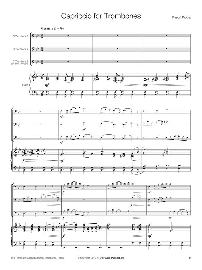 Le terme de capriccio désigne des compositions qui ne sont pas strictement liées à des conventions « classiques » et suivent leur propre inspiration. Le compositeur Pascal Proust se joue ici avec humour des attentes habituelles de l'auditeur : tantôt il confronte le lent groove swing du piano au rythme de barcarole des vents, tantôt il écrit une musique à la croisée du tango et du rock pur. Une pièce de concert efficace et variée pour quatre musiciens ambitieux !