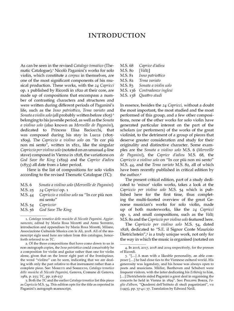 Ce Capriccio per violino solo M.S. 54 doit être considéré comme faisant partie du groupe de courtes dédicaces musicales que Paganini avait l’habitude de donner à ses amis, collègues et aux personnalités qu’il rencontrait lors de ses voyages. Daté de 1828, dédié au comte Maurizio Dietrichstein, est une œuvre véritablement unique, non seulement par la manière dont la musique est organisée (notée sur quatre portées, une pour chaque corde), mais aussi pour la manière dont elle a été conçue musicalement. Le concept de polyphonie est porté à un niveau extrême, du moins sur le plan conceptuel et visuel, dans cette composition. Sa brève structure rappelle une sorte de choral à quatre voix écrit en partition. Elle se caractérise par son style lyrique et élégant, où les quatre voix se déplacent de manière polyphonique, donnant naissance à une texture harmonique extrêmement raffinée. Cette édition critique est basée sur le manuscrit conservé à la Österreichische Nationalthek de Vienne, comparé aux éditions modernes.