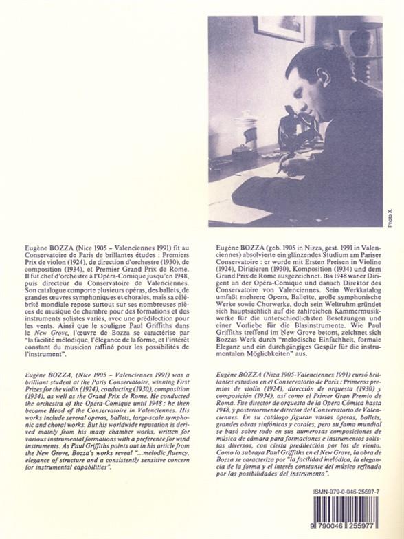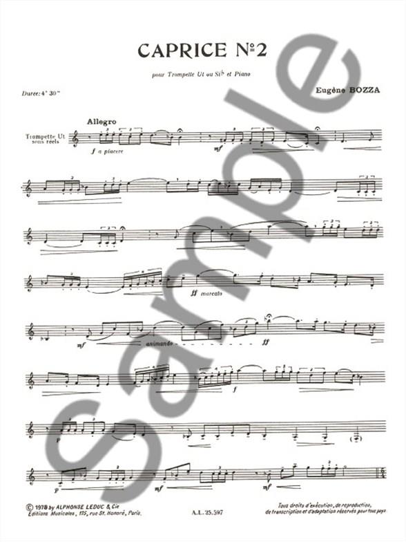 To this day, Eugène Bozza (1905-1991) remains one of the most prolific composers for wind instruments, despite being a violinist himself. His Caprice No. 2 for Trumpet with Piano accompaniment is no exception to the composer's success. During his studies at the Paris Conservatoire, Bozza won prizes for Violin, conducting and composition, as well as the Grand Prix de Rome. He then conducted the orchestra of the Opera-Comique and became Head of the Conservatoire in Valenciennes, whilst remaining a prominent composer. Composed in 1978, Bozza 's Caprice No. 2 addresses advanced aspects of theTrumpet, including complex rhythms, exploited tonalilty and articulation. As music educationalist, Paul Griffiths has written of Bozza 's compositions, 'his works reveal melodic fluency, elegance of structure and a consistenly sensitive concern of instrumental capabilities. '