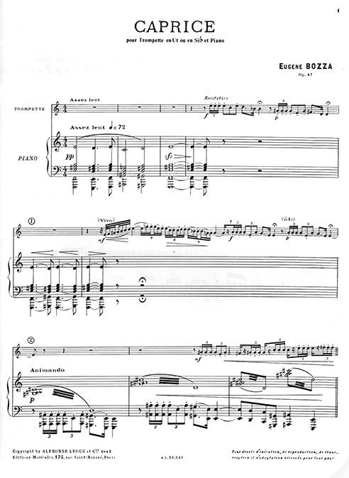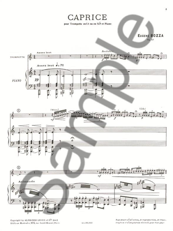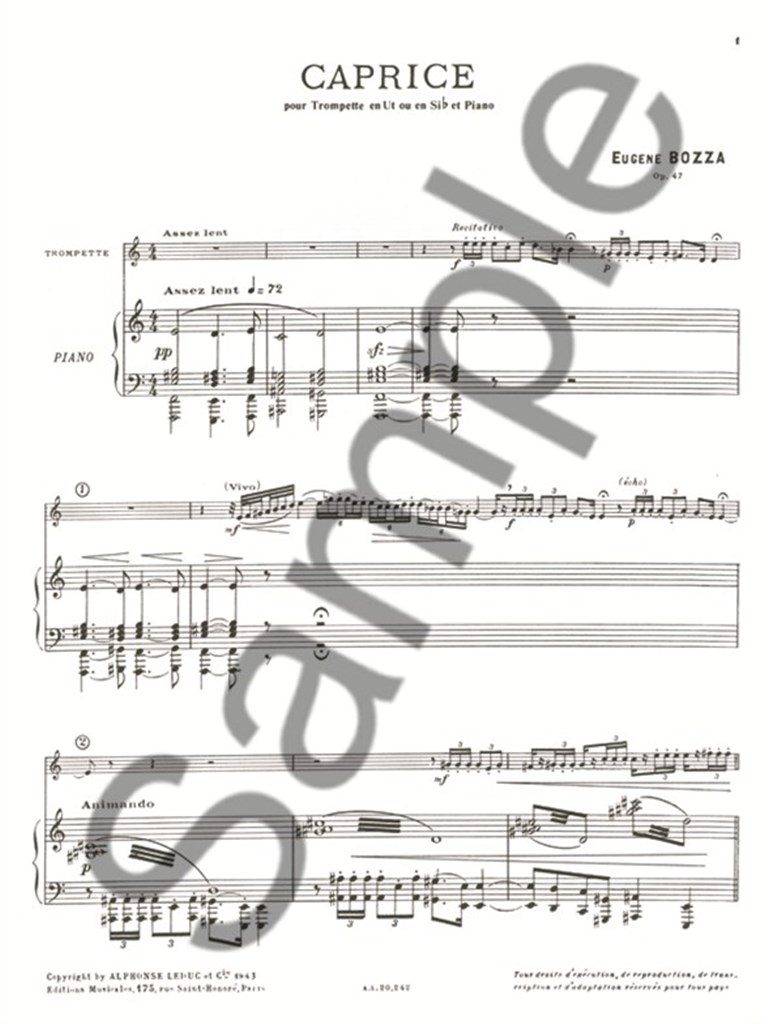 Eugène Bozza 's Caprice is an exciting addition to the trumpeter's repertoire. Exploiting the instrument's potential to its full capacity, Caprice is ideal performance repertoire. Born in Nice, Bozza (1905-1991) went on to study at the Paris Conservatoire, winning prizes for the violin, conducting and composition, as well as the Grand Prix de Rome. His capability clearly comes across in his Caprice for Trumpet and Piano through thrilling semiquaver flourishes and energetic scalic descents, beautifully contrasted by expressive lento passages. Bozza 's Caprice is essential to all advanced trumpeter's repertoire.
