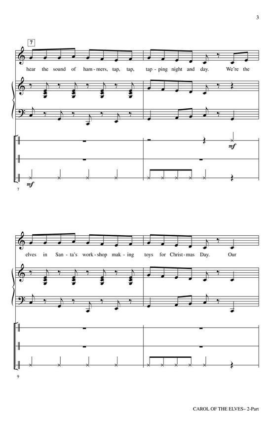 La mélodie traditionnelle Sarasponda est mise en musique avec des paroles originales racontant l’histoire d’elfes qui construisent joyeusement des jouets. Les instruments de percussion imitent le son des outils de tapotement tandis que la chanson originale en duo de tintements joyeux et de paroles rythmées s’unit pour créer un merveilleux spectacle choral de fête pour les jeunes voix.