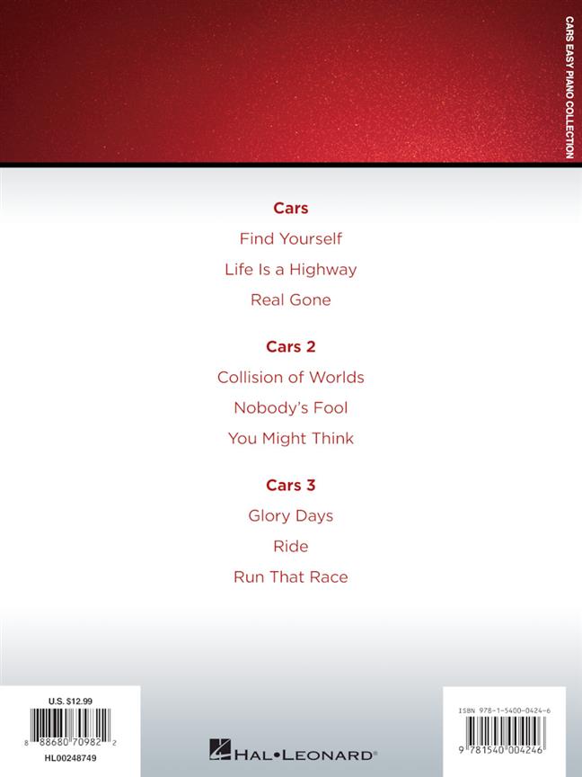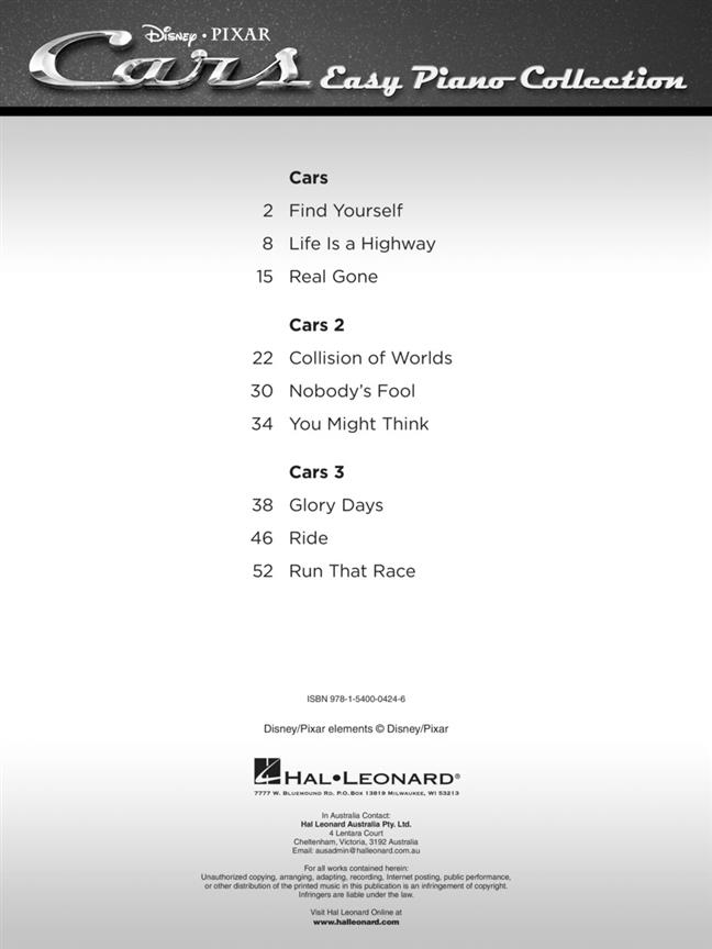 A trio of songs from each film in Disney/Pixar's Cars trilogy are featured in this collection for easy piano with lyrics. Songs include: Collision of Worlds - Find Yourself - Glory Days - Life Is a Highway - Nobody's Fool - Real Gone - Ride - Run That Race - You Might Think.