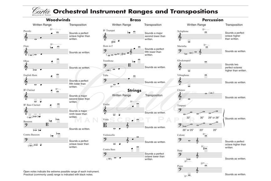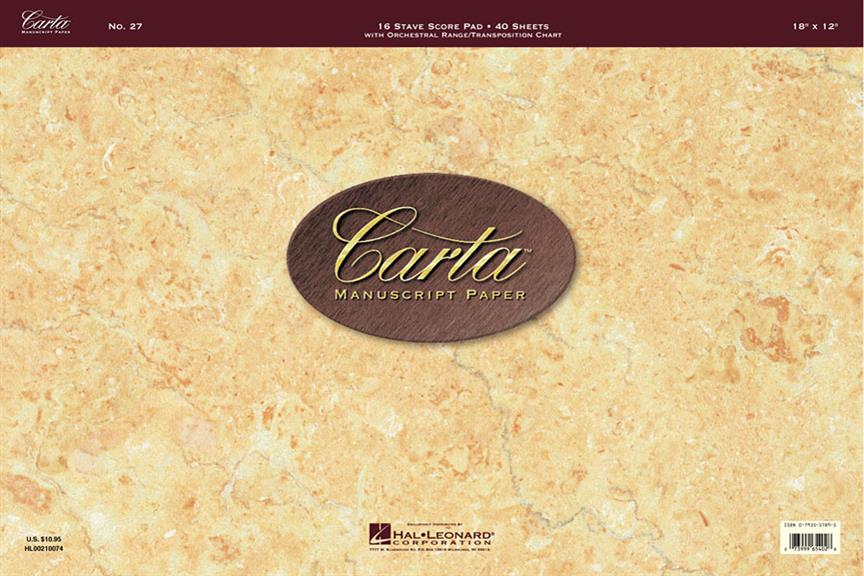 16 stave score pad, 18x12, 40 sheets, includes Orchestral Range/Transposition Chart.