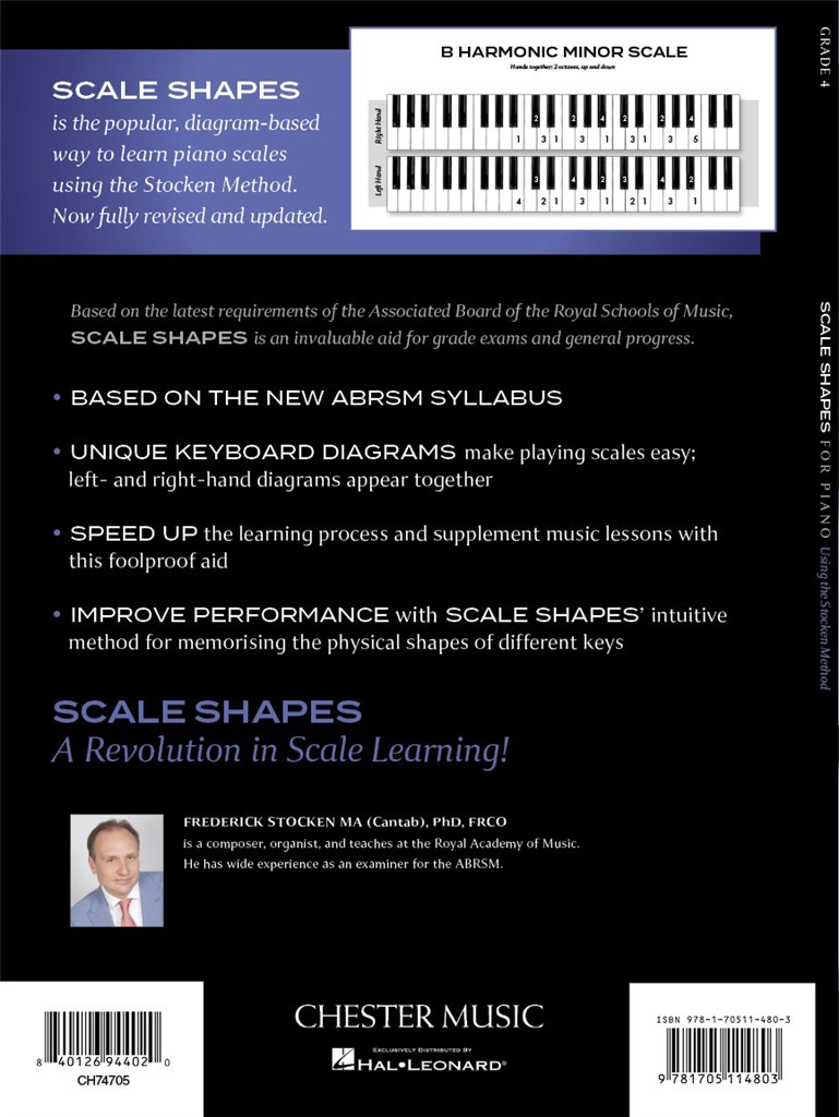 Trusted by hundreds of teachers since 2001, Scale Shapes is the popular, diagram-based way to learn piano scales using the Stocken Method. Based on the new ABRSM syllabus, this fully revised and updated third edition is an invaluable aid for grade exams and general progress. • BASED ON THE NEW ABRSM SYLLABUS • UNIQUE KEYBOARD DIAGRAMS make playing scales easy; left- and right-hand diagrams appear together • SPEED UP the learning process and supplement music lessons with this foolproof aid • IMPROVE PERFORMANCE with SCALES SHAPES’ intuitive method for memorising the physical shapes of different keys