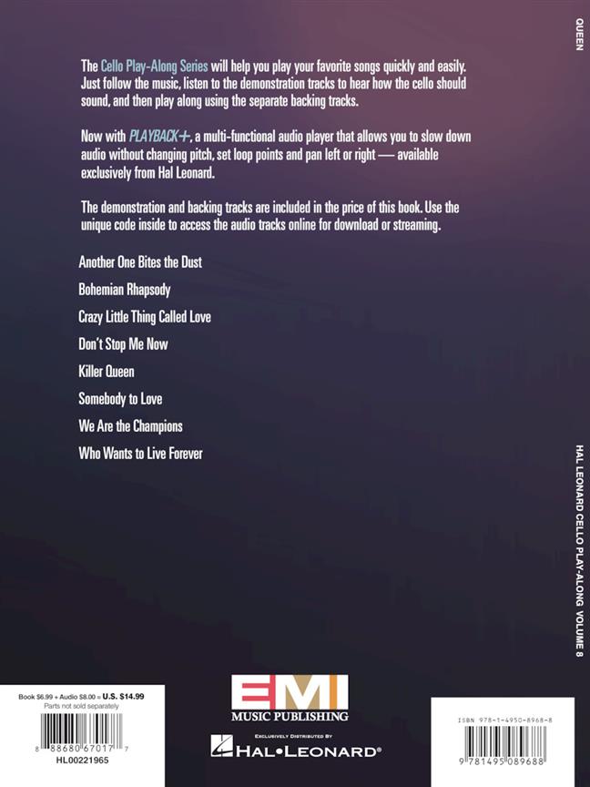 The Cello Play-Along Series will help you play your favorite songs quickly and easily. Just follow the printed music and play along using the original backing tracks available online for download or streaming. This volume includes: Another One Bites the Dust - Bohemian Rhapsody - Crazy Little Thing Called Love - Don't Stop Me Now - Killer Queen - Somebody to Love - We Are the Champions - Who Wants to Live Forever.