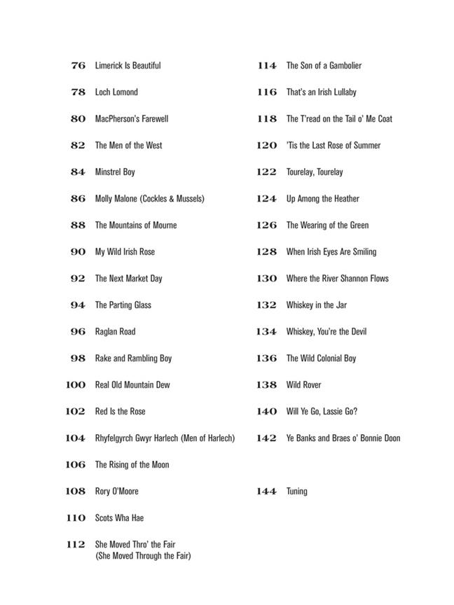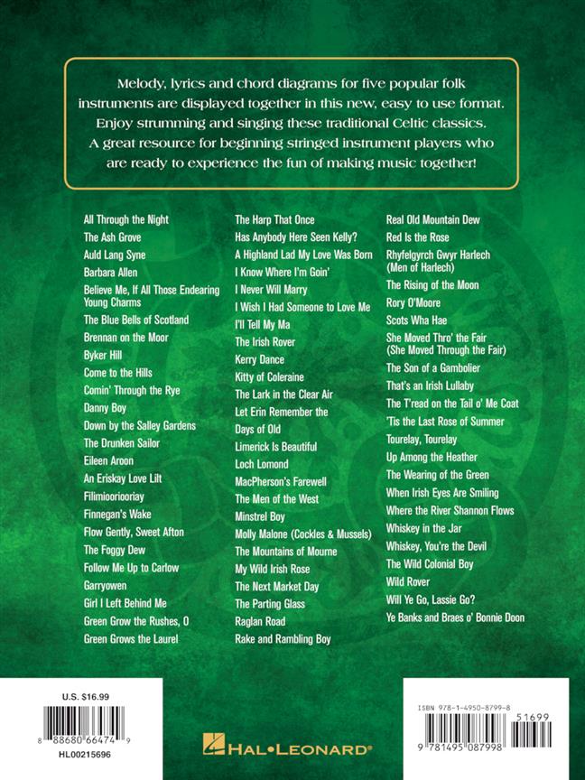 The Strum Together series enables players of five different instruments - or any combination of them - to strum together on dozens of great songs. This new, easy-to-use format features melody, lyrics, and chord diagrams for five popular folk instruments: standard ukulele, baritone ukulele, guitar, mandolin, and banjo. This collection includes 70 traditional Celtic classics: The Ash Grove - Barbara Allen - The Blue Bells of Scotland - Comin' Through the Rye - Danny Boy - Down by the Salley Gardens - The Drunken Sailor - Finnegan's Wake - Garryowen - A Highland Lad My Love Was Born - The Irish Rover - Kerry Dance - Loch Lomond - Molly Malone (Cockles and Mussels) - My Wild Irish Rose - Red Is the Rose - The Rising of the Moon - That's an Irish Lullaby - 'Tis the Last Rose of Summer - Tourelay, Tourelay - When Irish Eyes Are Smiling - Whiskey in the Jar - Will Ye Go, Lassie Go? - Ye Banks and Braes O' Bonnie Doon - and more.