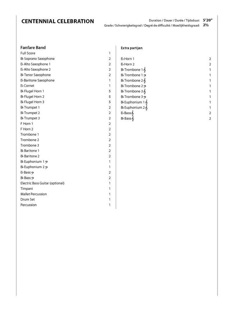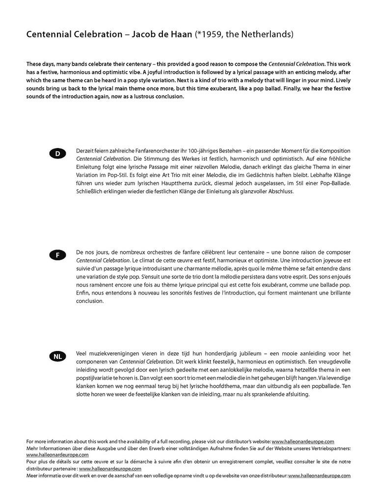 De nos jours, de nombreux orchestres de fanfare célèbrent leur centenaire – une bonne raison de composer Centennial Celebration. Le climat de cette œuvre est festif, harmonieux et optimiste. Une introduction joyeuse est suivie d’un passage lyrique introduisant une charmante mélodie, après quoi le même thème se fait entendre dans une variation de style pop. S’ensuit une sorte de trio dont la mélodie persistera dans votre esprit. Des sons enjoués nous ramènent encore une fois au thème lyrique principal qui est cette fois exubérant, comme une ballade pop. Enfin, nous entendons à nouveau les sonorités festives de l’introduction, qui forment maintenant une brillante conclusion.