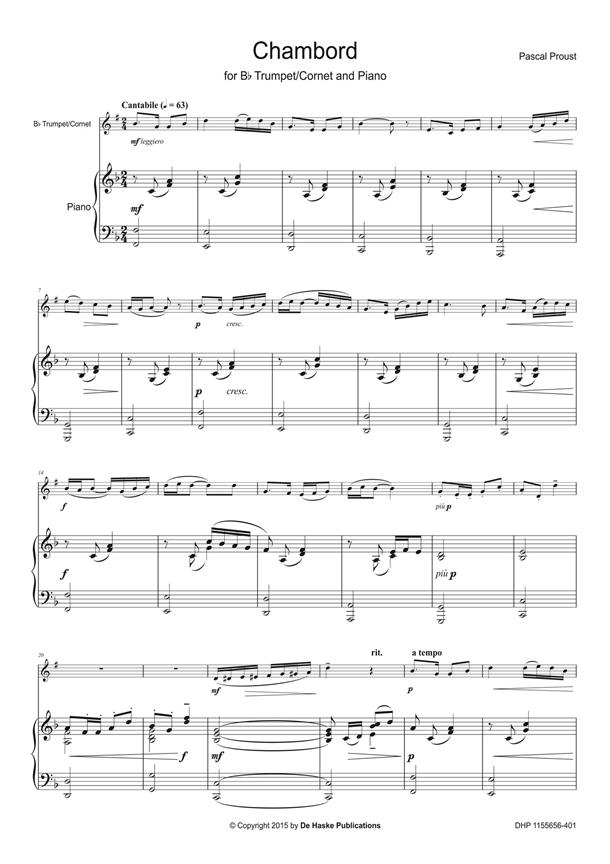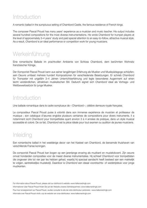 Le compositeur Pascal Proust puise à volonté dans son immense expérience de musicien et professeur de musique - son catalogue d'oeuvres englobe plusieurs centaines de compositions pour divers instruments. Il a notamment écrit Chambord pour trompettistes ayant environ 3 à 4 années de pratique, dans un style musical accessible et coloré. De ce fait, Chambord est la pièce idéale pour tout examen ou audition de jeunes musiciens.