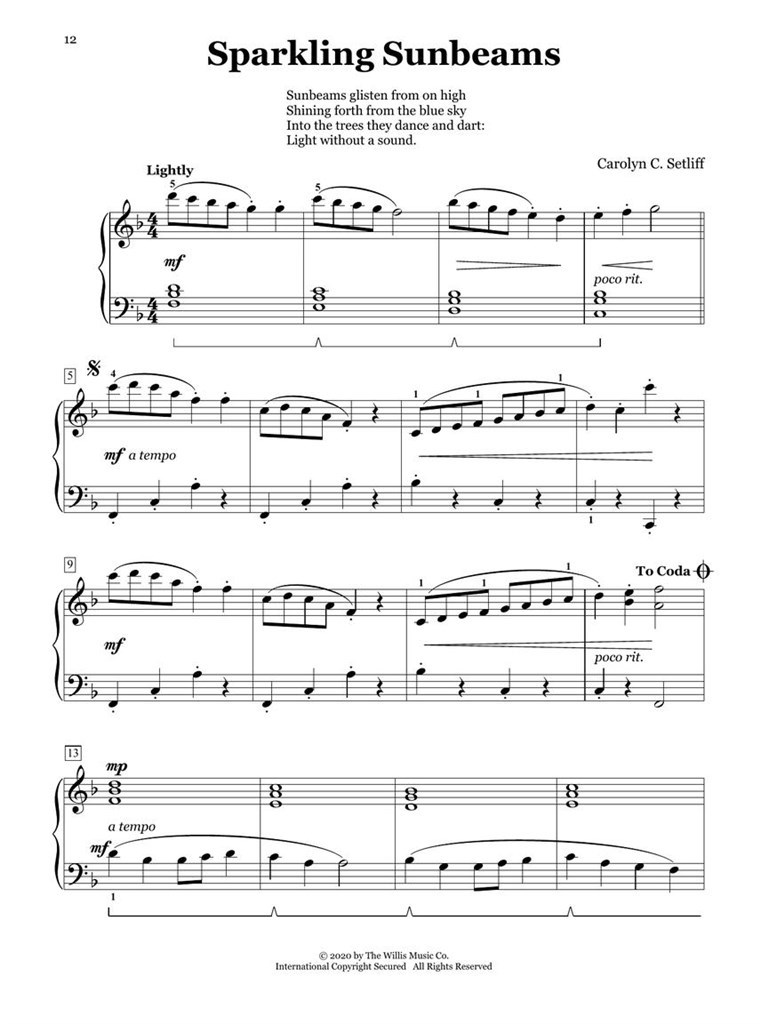 Huit courts solos lyriques, chacun avec un court poème pour faciliter l’interprétation. Toutes les pièces sont écrites en format ternaire facile à mémoriser (ABA), ce qui les rend idéaux pour un premier récital !