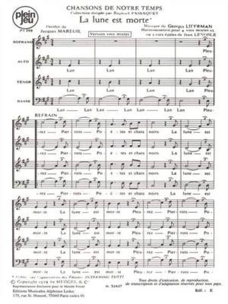 Chansons De Notre Temps/Pj380 La Lune Est Morte/4 Voix Mixtes Et 3 Voix Egales LIFERMAN / MAREUIL