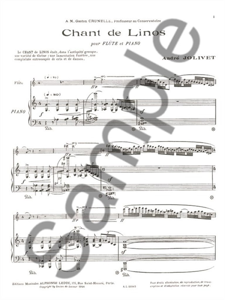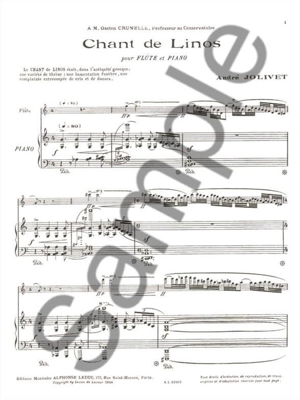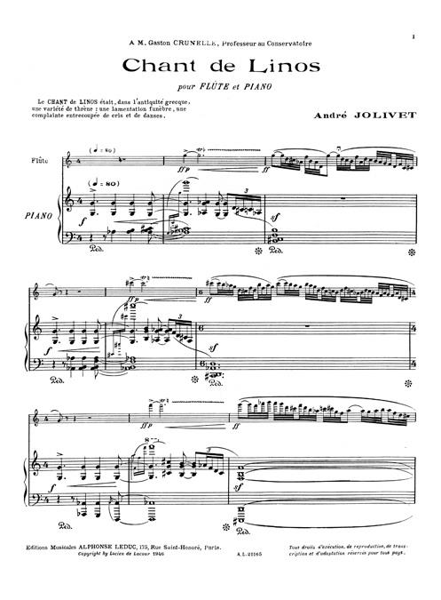André Jolivet (1905-1974) composed Chant de Linos for the Solo de Concours at the Paris Conservatoire in 1944. Initially written for Flute, Harp and String Trio, this version contains the scores for the Flute and the Piano. This piece is quite difficult to execute but will stand out in a competition or a recital. Inspired from what is called a Chant de Linos, a threnody (or lament to the dead) in the Greek antiquity, this piece is also about Linos, son of Apollo. A good music player, Linos taught Orpheus the Lyre and was killed by Heracles for criticising him too much. André Jolivet is a French composer who was really inspired by the Antiquity and had a strong interest foratonality. He also wrote many chamber music pieces, eleven concertos, some orchestral and some vocal music.