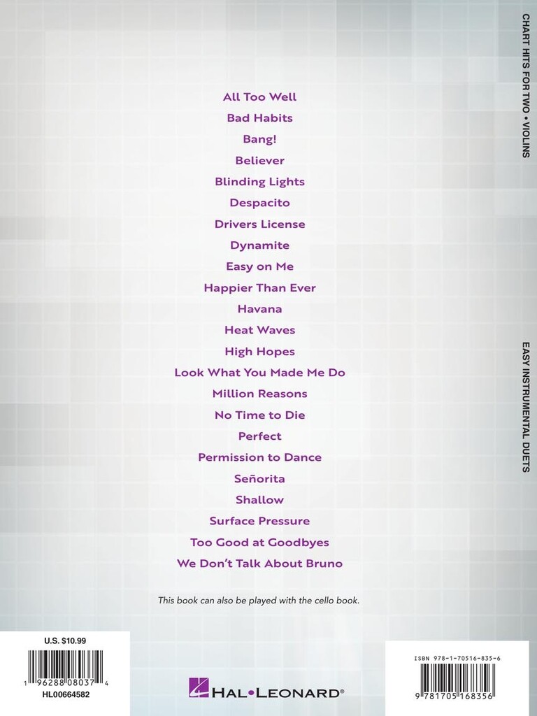 Apprendre à jouer en duo est une composante essentielle de toute formation instrumentale. La collection de Hal Leonard, Easy Instrumental Duets, propose des duos de niveau facile à intermédiaire pour se perfectionner tout en jouant des musiques divertissantes. Tous les arrangements fonctionnent pour deux instruments identiques ou peuvent être utilisés avec les autres recueils de cette famille d'instruments. Dans cette collection, on trouve le populaire Chart Hits for Two, dont la dernière édition propose les meilleurs morceaux de 2022 pour violon, violoncelle, flûte, clarinette, saxophone, trompette et trombone. Titres inclus : All Too Well · Bad Habits · Bang! · Blinding Lights · Happier Than Ever · Heat Waves · High Hopes · Señorita · We Don't Talk About Bruno · et bien d'autres.
