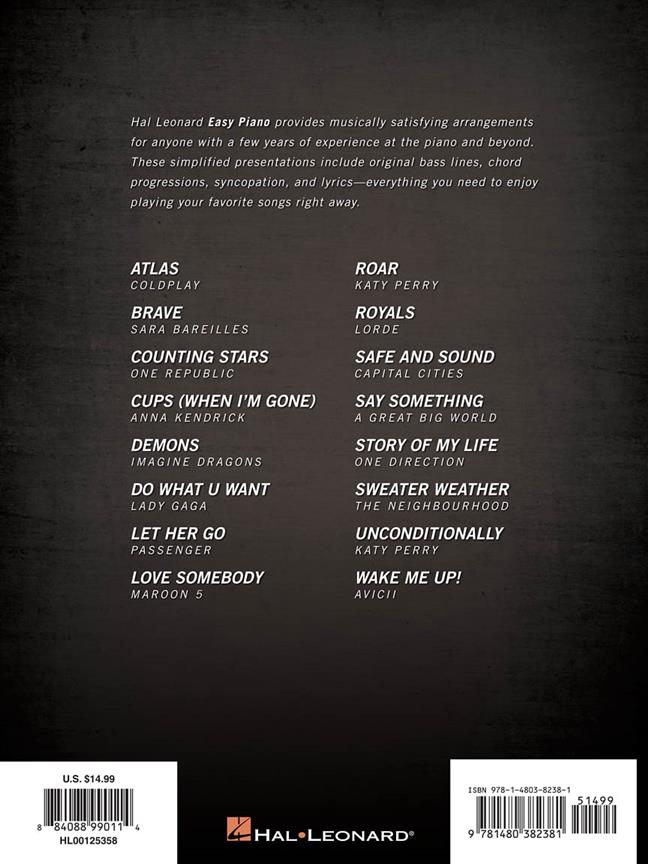 16 titres incontournables de la fin 2013 et du début 2014 spécialement arrangés pour pianiste débutants avec les paroles complètes et les accords. Titres :Atlas [Coldplay] - Brave [Bareilles, Sara] - Counting Stars [OneRepublic] - Cups (When I'm Gone)[Kendrick, Anna] - Demons [Imagine Dragons] - Do What U Want [Lady Gaga] - Let Her Go [Passenger] - Love Somebody [Maroon 5] - Roar [Perry, Katy] - Royals [Lorde] - Safe And Sound [Capital Cities] - Say Something [A Great Big World] - Story Of My Life [One Direction] - Sweater Weather [The Neighbourhood] - Unconditionally [Perry, Katy] - Wake Me Up! [Avicii]