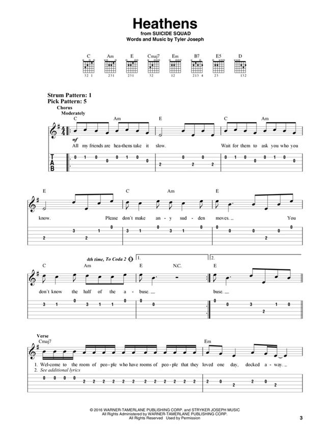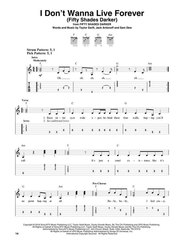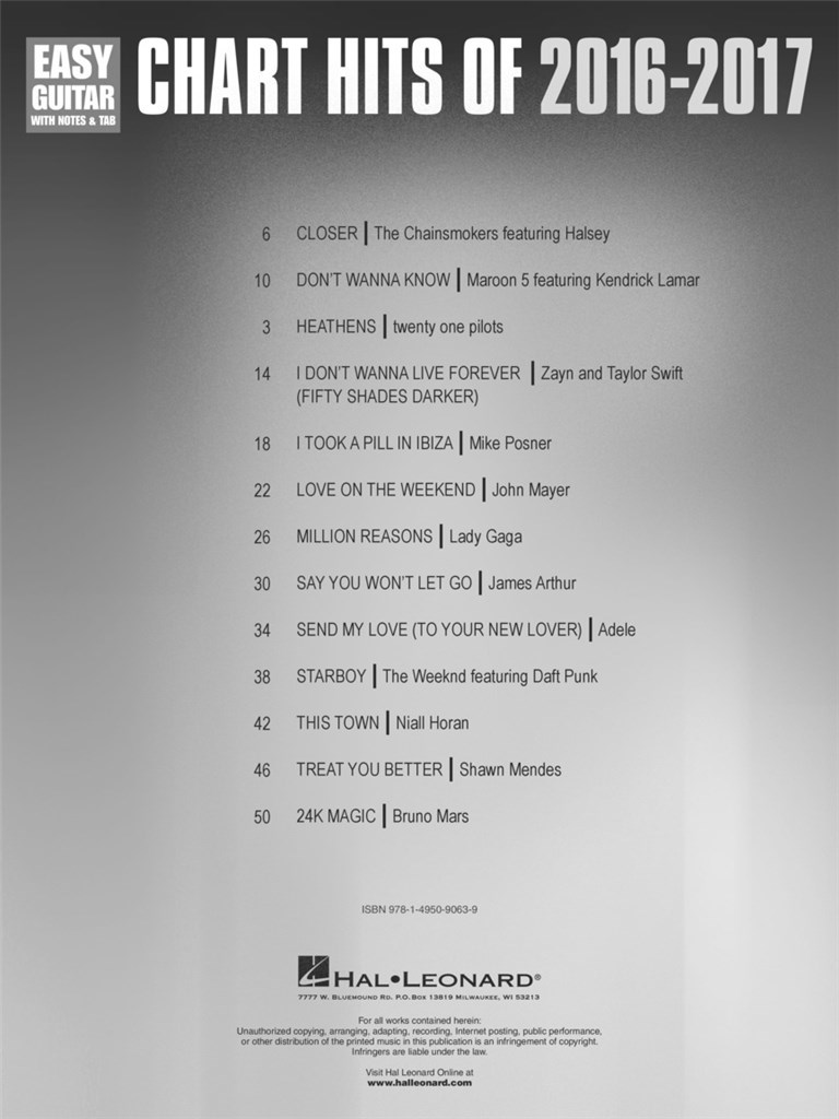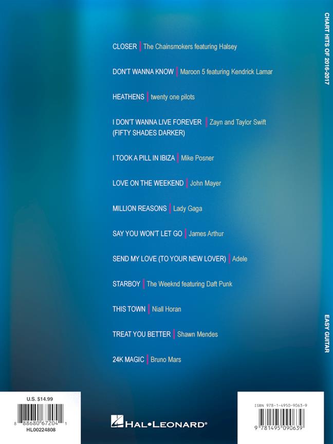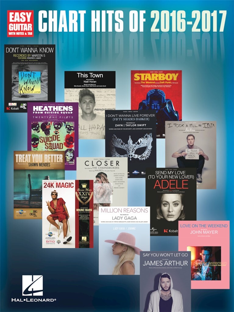 13 of the year's hottest hits arranged at an accessible level for budding guitarists. Includes: Closer - Heathens - I Don't Wanna Live Forever (Fifty Shades Darker) - I Took a Pill in Ibiza - Say You Won't Let Go - Send My Love (To Your New Lover) - Starboy - This Town - and more.