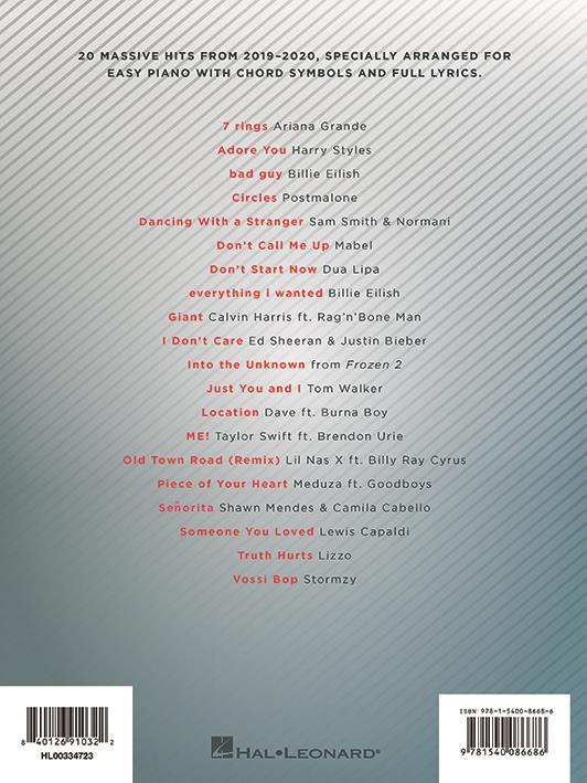 20 massive hits from 2019-2020, specially arranged for easy piano with chord symbols and full lyrics.