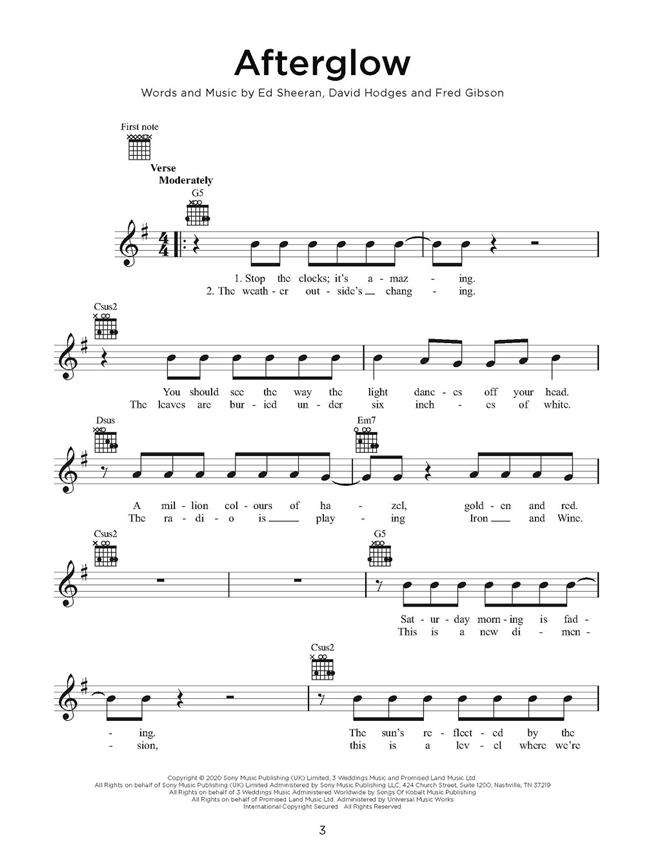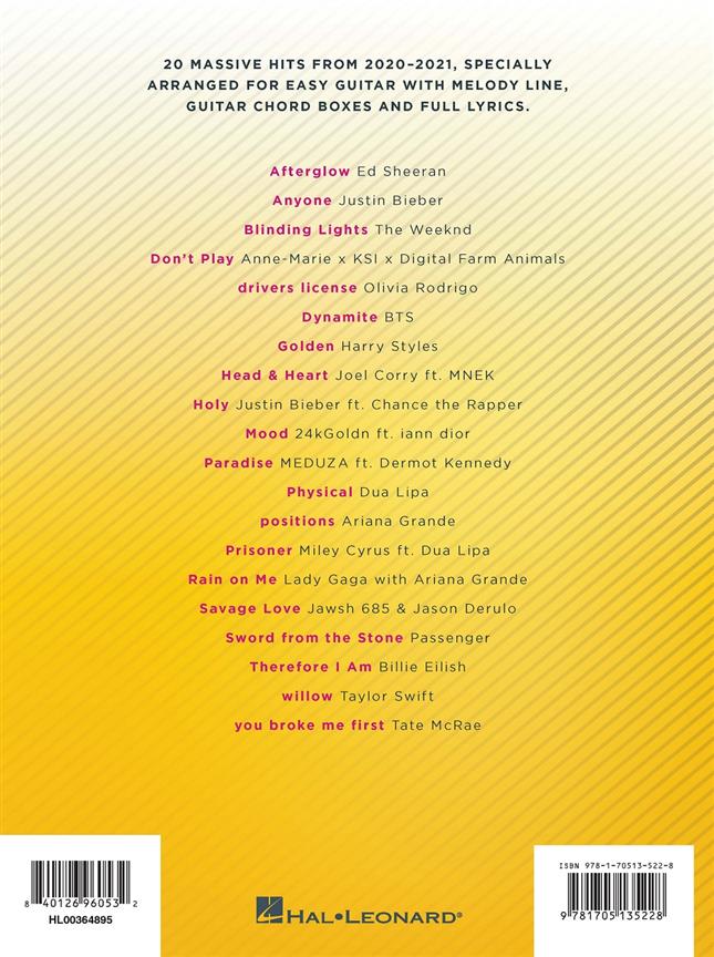 20 massive hits from 2020-2021, specially arranged for easy guitar with melody line, guitar chord boxes and full lyrics. Includes ‘drivers license’, ‘Head & Heart’, ‘positions’, ‘willow’, and many more!