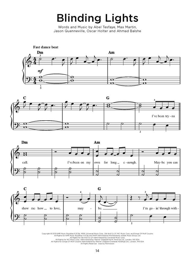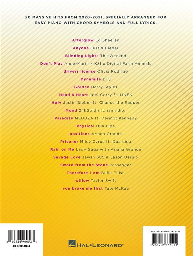 20 massive hits from 2020-2021, specially arranged for easy piano with chord symbols and full lyrics. Includes ‘drivers license’, ‘Head & Heart’, ‘positions’, ‘willow’, and many more!