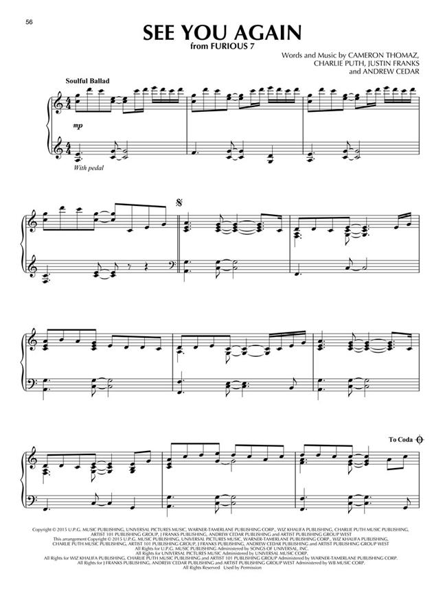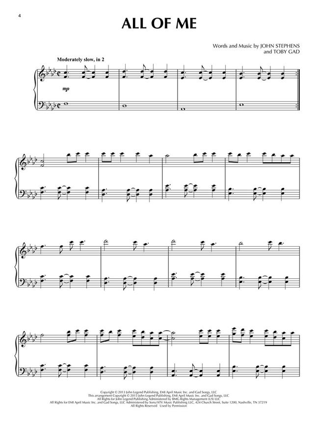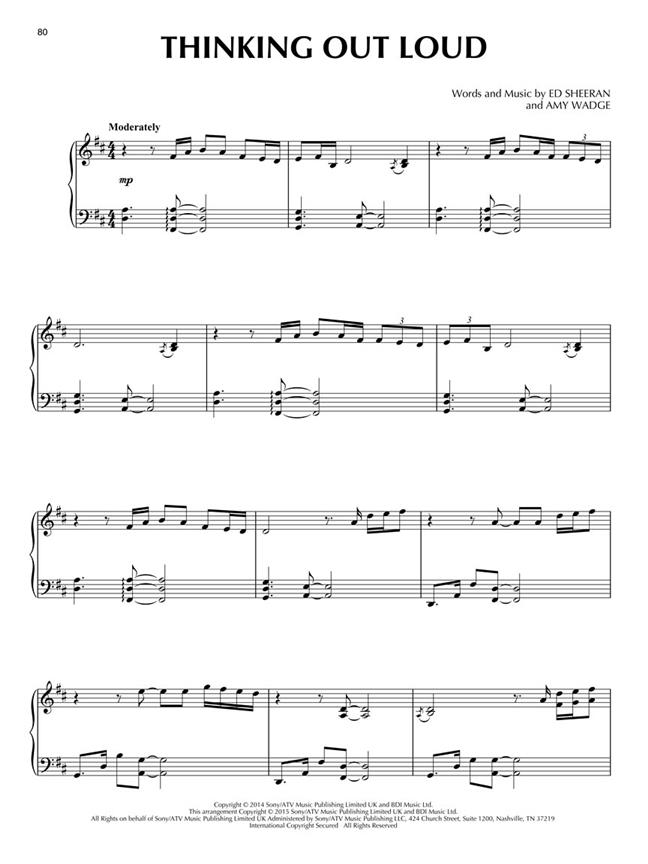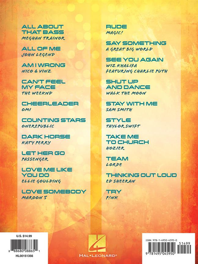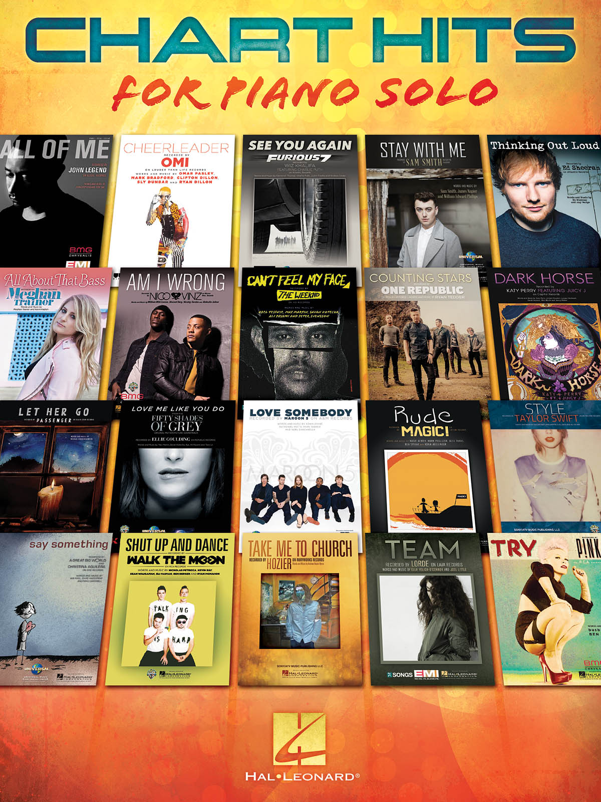 Piano solo arrangements of twenty top pop hits, including: All About That Bass (Meghan Trainor) - All of Me (John Legend) - Can't Feel My Face (The Weeknd) - Cheerleader (OMI) - Love Me like You Do (Ellie Goulding) - Love Somebody (Maroon 5) - Rude (Magic) - Shut up and Dance (Walk the Moon) - Stay with Me (Sam Smith) - Style (Taylor Swift) - Thinking Out Loud (Ed Sheeran) - and more.