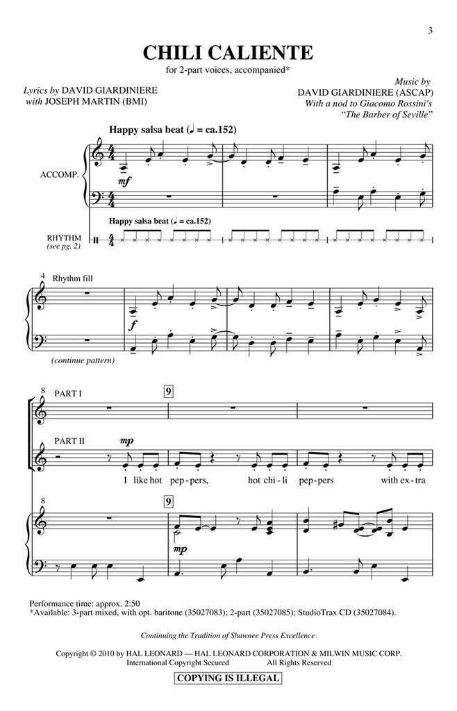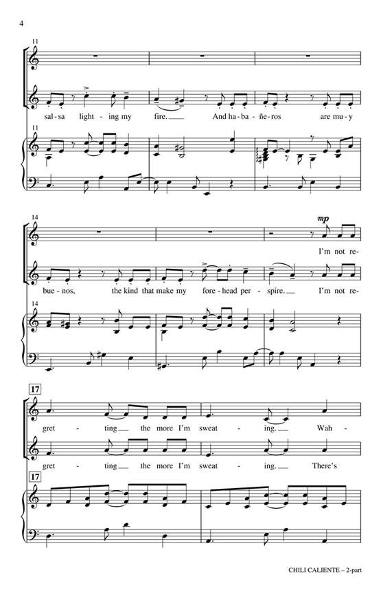 Certains aiment la chaleur, d’autres encore plus ! Cette pièce originale mêle le son épicé du Barbier de Séville de Rossini à des paroles brûlantes de poivrons, de salsa et de brûlures d’estomac ! « Mes yeux sont une flamme et je ne me lasse jamais de la brûlure ! Chaud ! » Gardez l’antiacide à portée de main pour les performances ! Disponible séparément : mixé à 3 voix, baryton et percussions en option ; percussions à deux voix, optionnelles ; CD StudioTrax. Durée : environ 2:50.