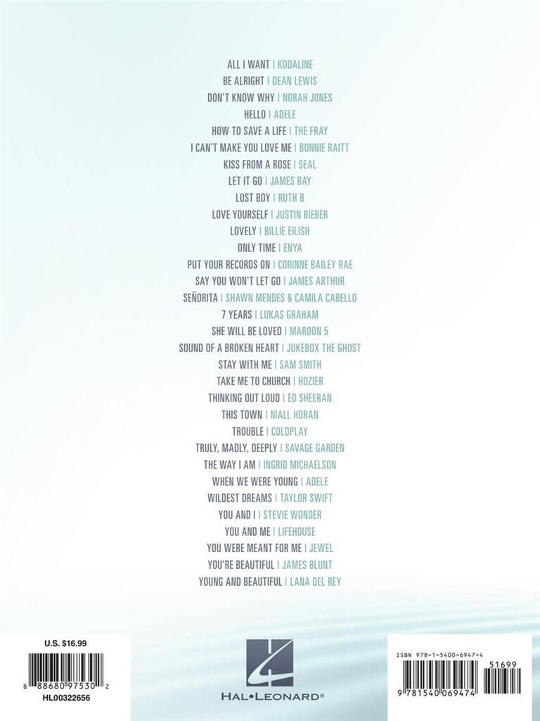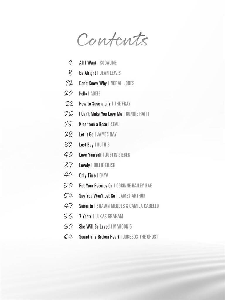 Plus de 30 arrangements pop introspectifs pour piano solo, dont : All I Want (Kodaline) · Je ne sais pas pourquoi (Norah Jones) · Bonjour (Adele) · Je ne peux pas te faire m’aimer (Bonnie Raitt) · Baiser d’une rose (Phoque) · Aimez-vous (Justin Bieber)· Lovely (Billie Eilish) · Mettez vos disques (Corinne Bailey Rae) · Senorita (Shawn Mendes & Camila Cabello) · Elle sera aimée (Maroon 5) · Penser à voix haute (Ed Sheeran) · Cette ville (Niall Horan) · Toi et moi (Stevie Wonder) · Tu es belle (James Blunt) · Et plus encore !