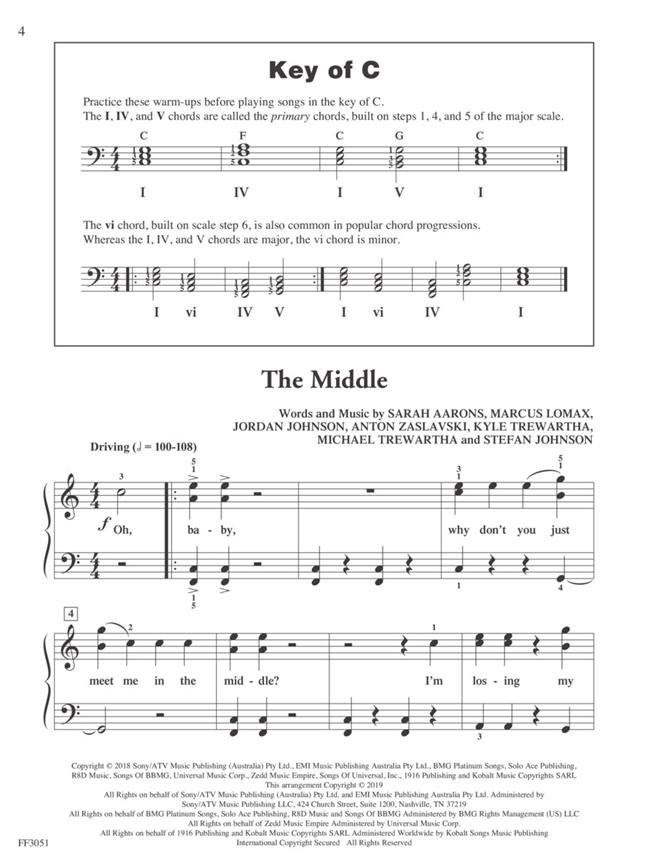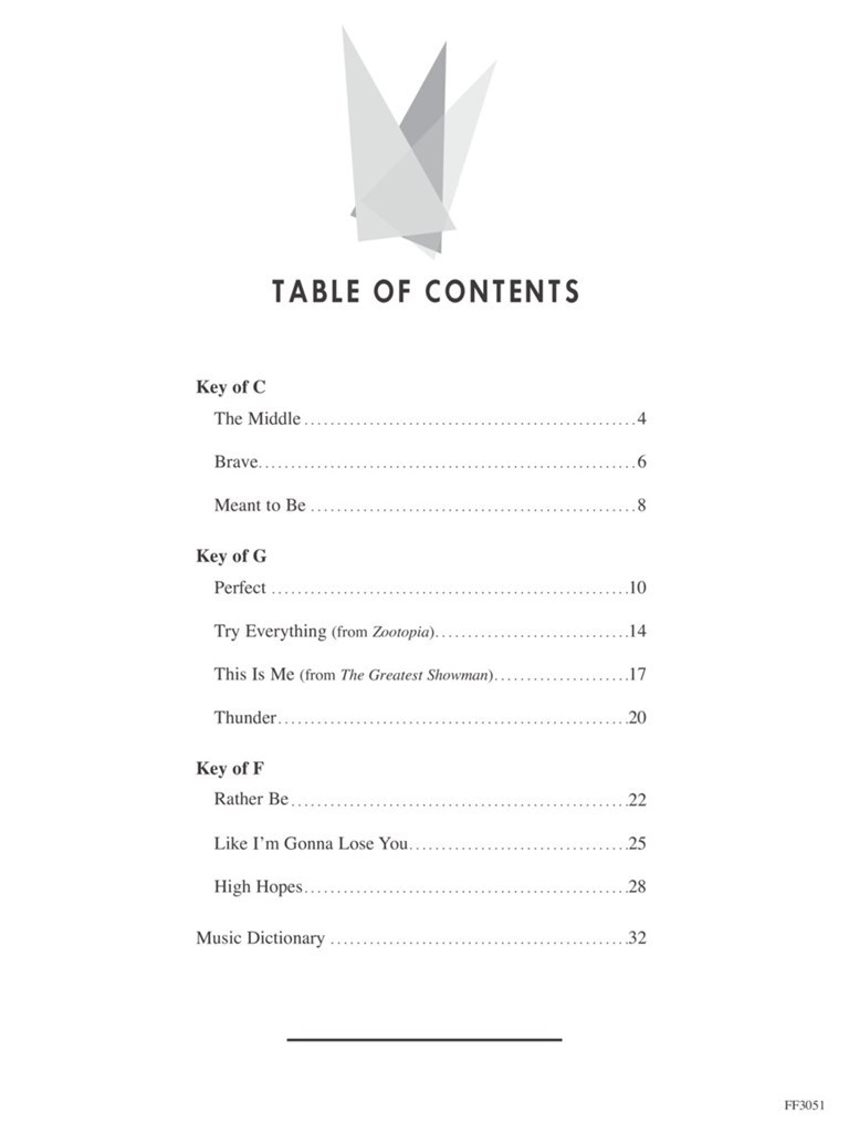 Enjoy 10 outstanding arrangements of popular hits by today's leading artists such as Ed Sheeran, Meghan Trainor, Imagine Dragons, and more. In keeping with the ChordTime concept, this collection motivates the Level 2B student to learn the building block harmonies of current pop music: the I, IV, V, and vi chords. Songs include: Brave (Sara Bareilles) · High Hopes (Panic! At the Disco) · Like I'm Gonna Lose You (Meghan Trainor feat. John Legend) · Meant to Be (Bebe Rexha feat. Florida Georgia Line) · The Middle (Zedd, Maren Morris & Grey) · Perfect (Ed Sheeran) · Rather Be (Clean Bandit feat. Jess Glynne) · This Is Me (from The Greatest Showman) · Thunder (Imagine Dragons) · Try Everything (Shakira, from Zootopia).