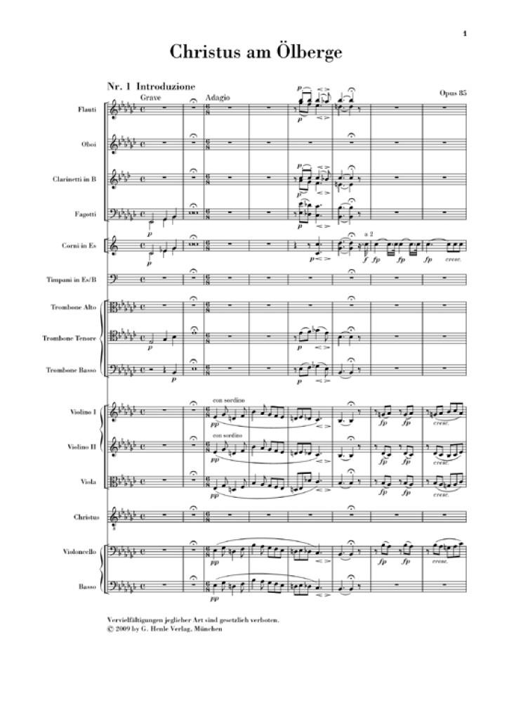 Compositeur attitré, fraîchement émoulu, du Theater an der Wien (Théâtre sur la Vienne), Beethoven a l’occasion, en 1803, de donner un oratorio pour la période de la Passion. En très peu de temps, il compose sa première et unique oeuvre du genre, ayant pour thème les souffrances du Christ et la prière au jardin de Gethsémané jusqu’à l’arrestation de Jésus. La maison d’édition de la première édition, qui désapprouve le livret «style opéra» de Franz Xaver Huber, fait remanier de sa propre autorité les textes après la création. Malgré l’opposition de Beethoven et les nouvelles corrections qu’il exige, c’est cette dernière version qui finit par se répandre dans le monde entier. Notreédition, conformément à l’édition musicologique des oeuvres complètes de Beethoven (Beethoven Gesamtausgabe), donne l’oeuvre selon le livret initialement mis en musique par le compositeur. ?