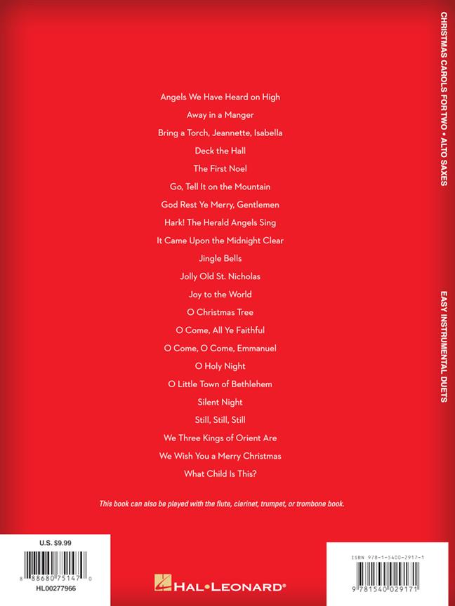 22 Christmas favorites for two instrumentalists are featured in this collection. Songs include: Angels We Have Heard on High · Away in a Manger · Deck the Hall · Jingle Bells · Joy to the World · O Holy Night · Silent Night · We Wish You a Merry Christmas · and more. This book can also be played with the flute, clarinet, trumpet, or trombone editions. 22 Christmas favorites for two instrumentalists are featured in this collection. Songs include: Angels We Have Heard on High - Away in a Manger - Deck the Hall - Jingle Bells - Joy to the World - O Holy Night - Silent Night - We Wish You a Merry Christmas - and more. This book can also be played with the flute, clarinet, trumpet, or trombone editions.