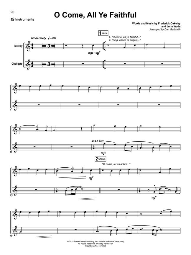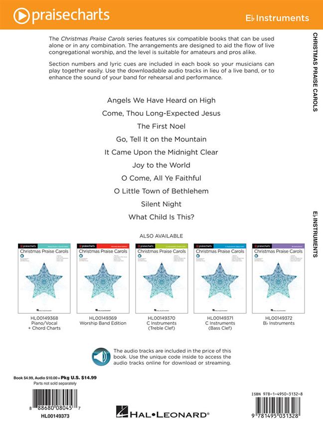 La série Christmas Praise Carols propose six livres compatibles pouvant être utilisés seuls ou dans n’importe quelle combinaison. Les arrangements sont conçus pour faciliter le déroulement du culte congrégationnel en direct, et le niveau convient aussi bien aux amateurs qu’aux professionnels. Les numéros de section et les paroles sont inclus dans chaque livre pour que vos musiciens puissent jouer ensemble facilement. Utilisez les pistes audio à la place d’un groupe live, ou pour améliorer le son de votre groupe lors des répétitions et des concerts. Les pistes audio sont accessibles en ligne à l’aide du code unique de chaque livre. Les morceaux peuvent être diffusés en streaming ou téléchargés selon vos préférences. Les chansons incluent : Anges que nous avons entendus en haut - Viens, toi Jésus longtemps attendu - Le premier Noël - Va, raconte-le sur la montagne - Il est venu à minuit clair - Joie au monde - Ô venez, tous fidèles - Ô petite ville de Bethléem - Nuit douce