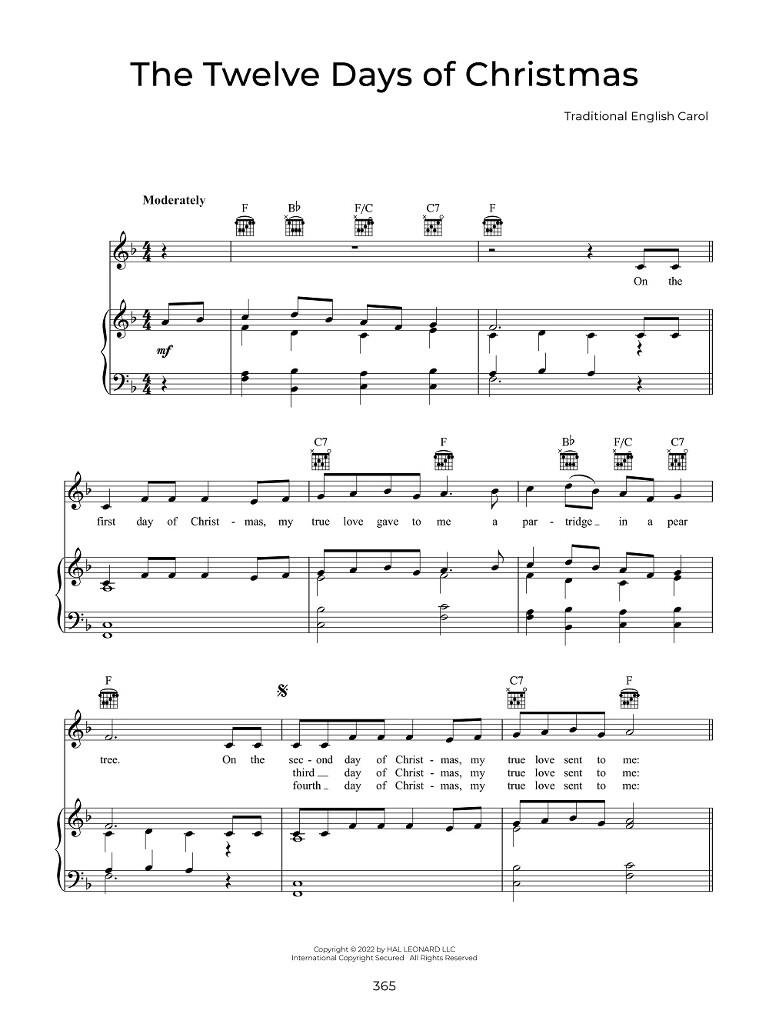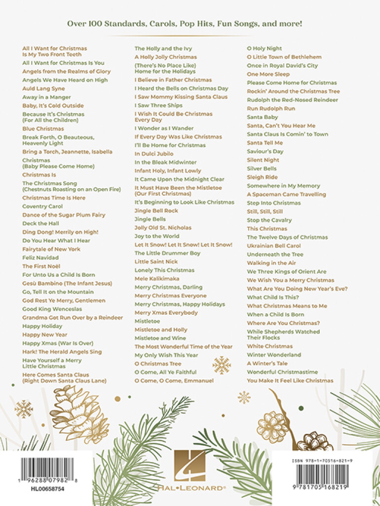 Plus de 100 standards de Noël essentiels arrangés pour piano, voix et guitare avec des symboles et grilles d'accords et les paroles complètes, le tout dans une superbe collection avec couverture gaufrée et reliure à spirale pour que le recueil reste bien à plat durant son utilisation. Titres inclus : All I Want for Christmas Is You", "Blue Christmas", "Deck the Hall", "Feliz Navidad", "Have Yourself a Merry Little Christmas", "Jingle Bells", "Let It Snow ! Let It Snow ! Let It Snow!', 'Merry Christmas Everyone', 'The Most Wonderful Time of the Year', 'O Holy Night', 'Rudolph the Red-Nosed Reindeer', 'Santa Baby', 'Santa Claus Is Comin' to Town', 'Silent Night', 'Step Into Christmas', 'Walking in the Air', 'White Christmas' et bien d’autres.