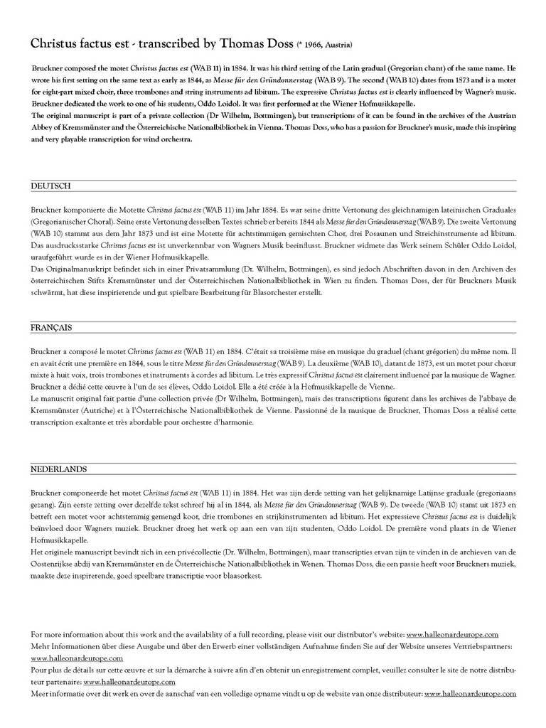 Thomas Doss a arrangé pour orchestre d’harmonie cette transcription exaltante et très abordable de Christus factus est (WAB 11), le motet écrit par Bruckner en 1884. Après la Messe für den Gründonnerstag (1844) et un motet pour chœur mixte à huit voix, trois trombones et instruments à cordes ad libitum (1873), cette œuvre est la troisième mise en musique du graduel (chant grégorien) du même nom. L’influence de Wagner se manifeste clairement.