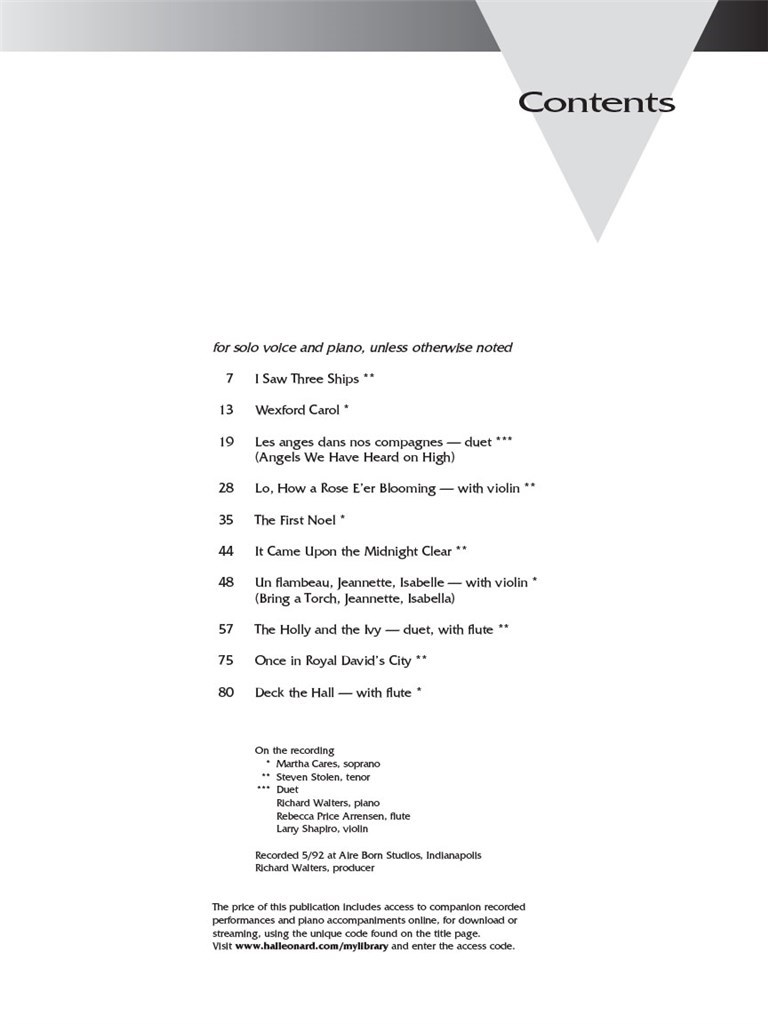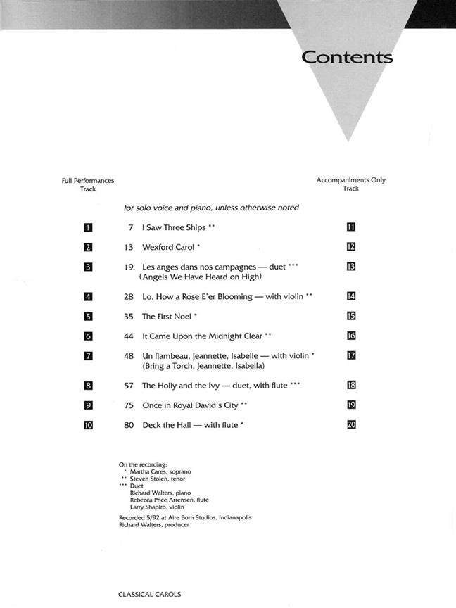 La bibliothèque vocale. Arrangements belles, douce, artistiques qui véritablement rendre art chansons de chants de Noël. Le CD d'accompagnement comprend des représentations complètes ainsi que des accompagnements. Comprend huit solos et deux duos, avec quatre les cantiques exigeant la flûte ou violon obligée