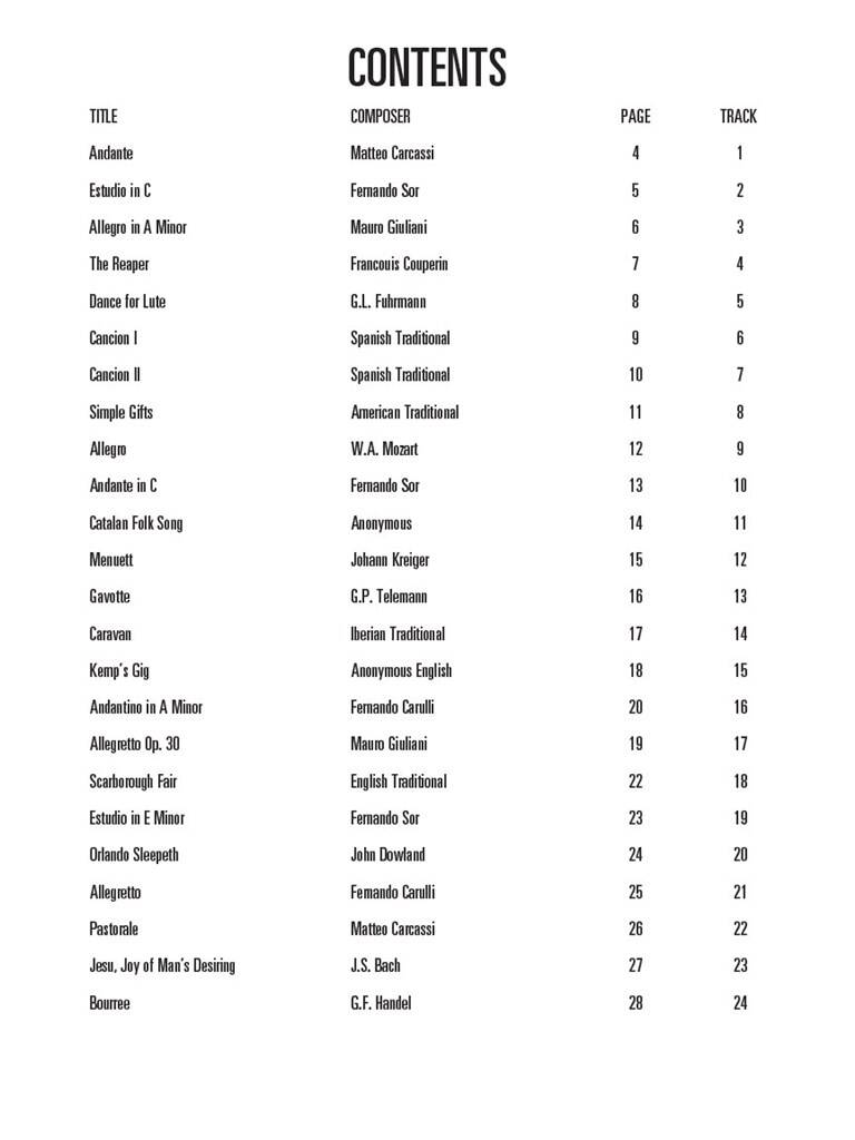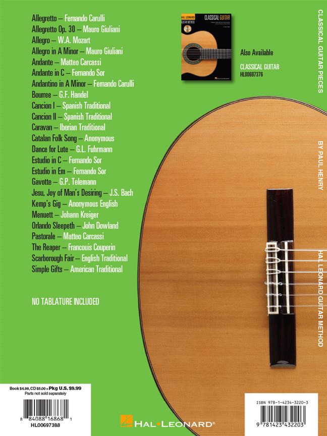 Excellent complément à la méthode Hal Leonard Classical Guitar Method (00697376), ce recueil de chansons avec audio en ligne propose 24 pièces idéales pour les élèves, dont : Allegretto (Fernando Carulli) · Allegro (Wolfgang Mozart) · Andante (Matteo Carcassi) · Andante en do (Fernando Sor) · Estudio (Fernando Sor) · Orlando Sleepeth (John Dowland) · Pastorale (Matteo Carcassi) · Dons simples (traditionnel américain) · et plus encore. Veuillez noter que ce livre ne contient pas de tablature. L’audio est accessible en ligne via le code unique contenu dans chaque livre et peut être diffusé en streaming ou téléchargé. Les fichiers audio incluent PLAYBACK+, un lecteur audio multifonction qui permet de ralentir le son sans changer de hauteur, de régler des points de boucle, de changer les touches et de faire un panoramique à gauche ou à droite.