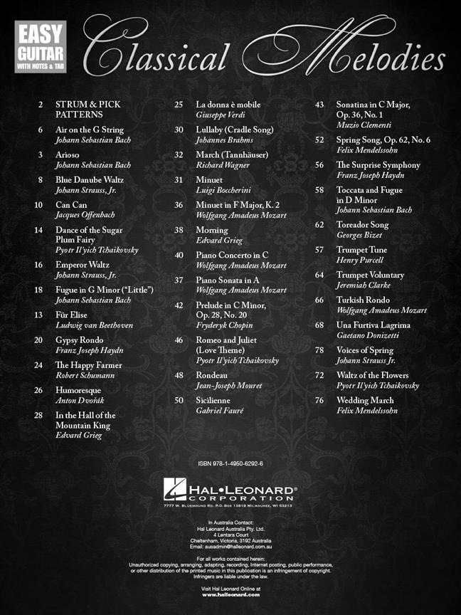 Cette collection pour guitare facile comprend 36 pièces arrangées en notation et tablature standard, notamment : Valse du Danube bleu (Strauss), Can Can (Offenbach), Danse de la fée du prunier à sucre (Tchaïkovski), Für Elise (Beethoven), Humoresque (Dvorak), Dans la salle du roi de la montagne (Grieg), Berceuse (Chanson du berceau) (Brahms), Roméo et Juliette (Thème d’amour) (Tchaïkovski), La Symphonie surprise (Haydn), Chanson des Toreadores (Bizet), Volontaire de trompette (Clarke), Rondo turc (Mozart), Marche nuptiale (Mendelssohn) et bien d’autres.