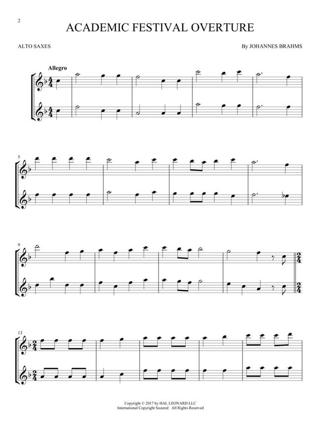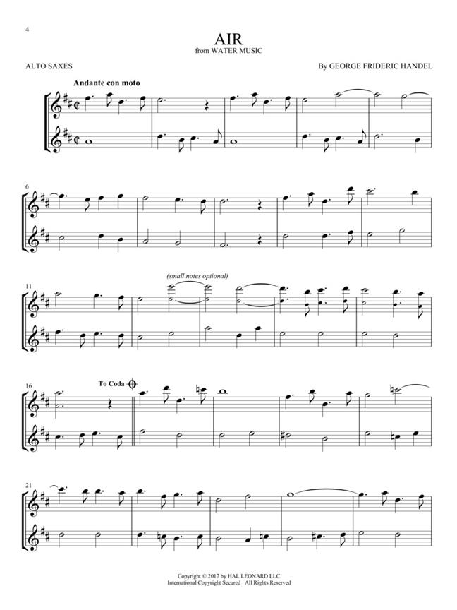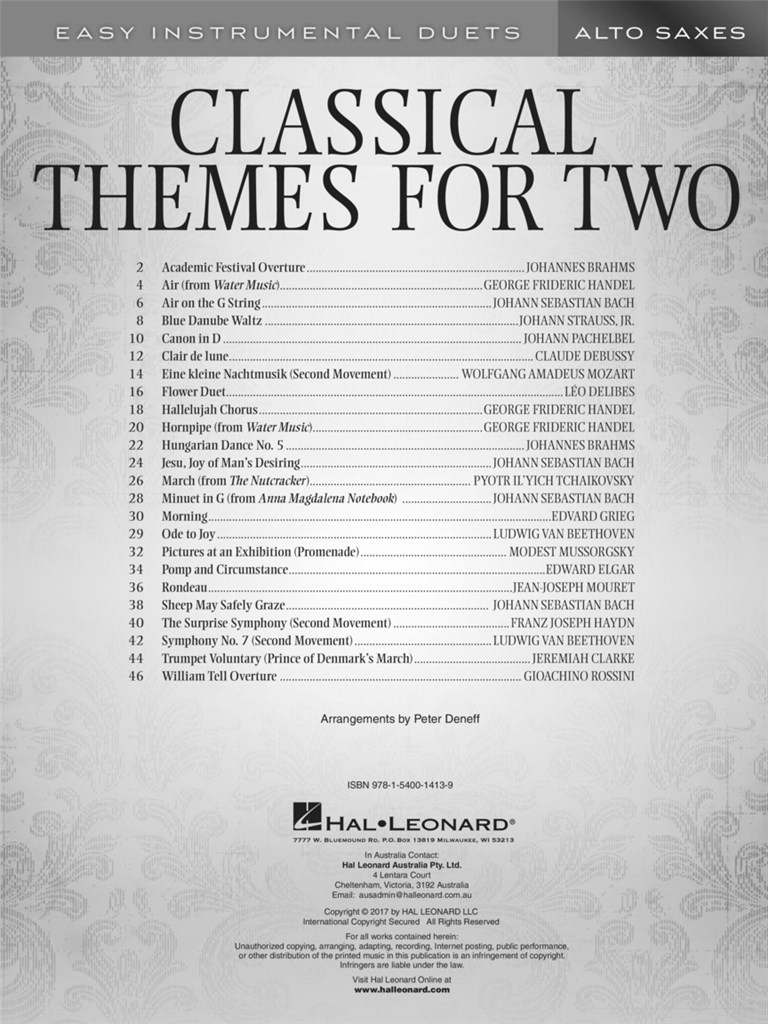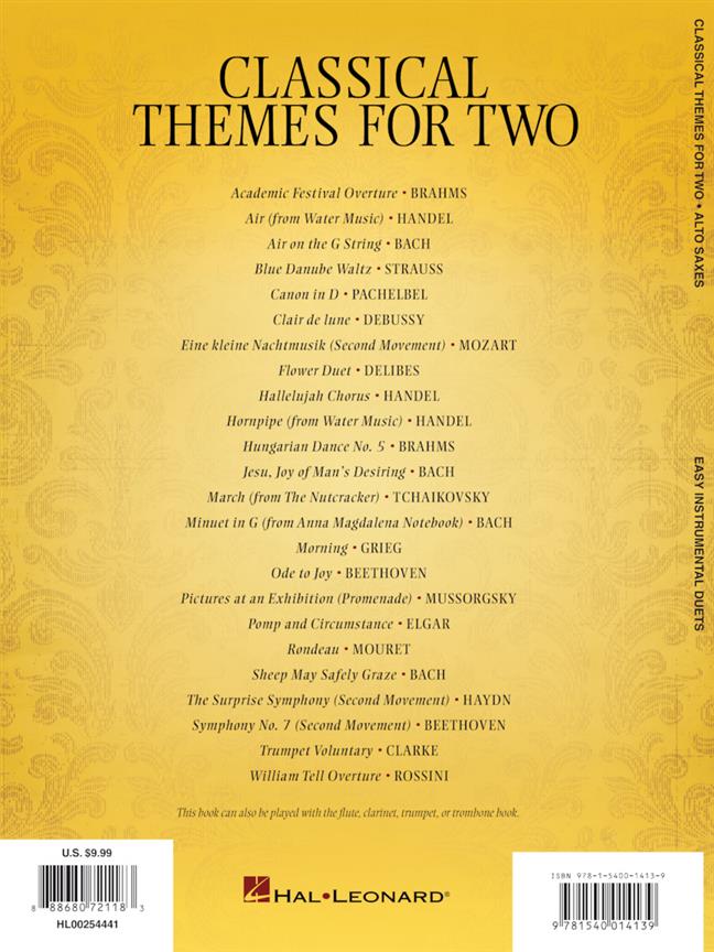 24 favorite melodies from top classical composers in easy duet arrangements for two instrumentalists are featured in this collection, including: Air on the G String - Blue Danube Waltz - Canon in D - Eine Kleine Nachtmusik - Hallelujah Chorus - Jesu, Joy of Man's Desiring - Minuet in G Major - Ode to Joy - Pictures at an Exhibition - Sheep May Safely Graze - Trumpet Voluntary - William Tell Overture - and more. Arrangements work for two clarinets or can be used with the other woodwind titles from this series.